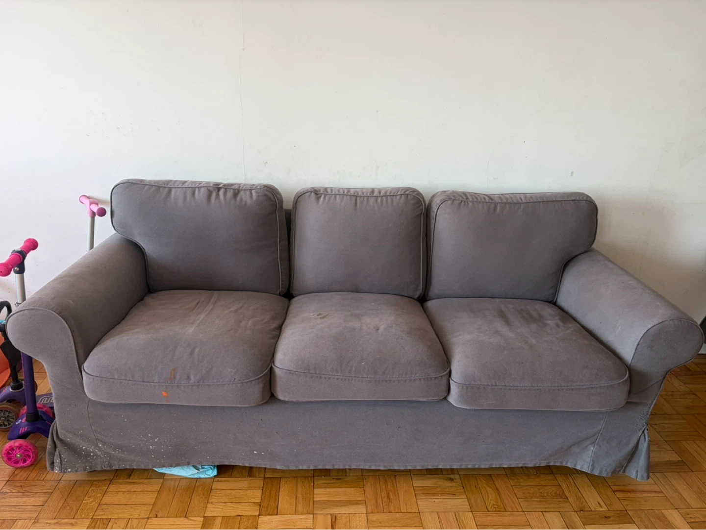 This is a gray three-seater sofa (UPPLAND from IKEA). It has a fabric slipcover that is removable with plenty color options to purchase from. The sofa is used and the current cover has some stains. (Available for pick up)