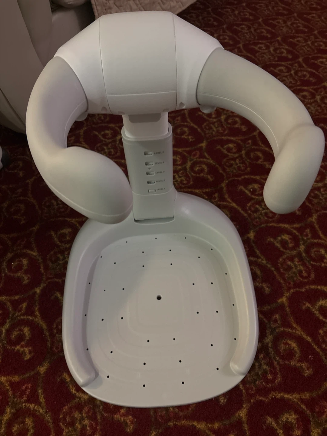 White replacement seat for a baby swing. It has multiple height adjustment levels. The seat has a draining base with many small holes. It's made of sturdy plastic.