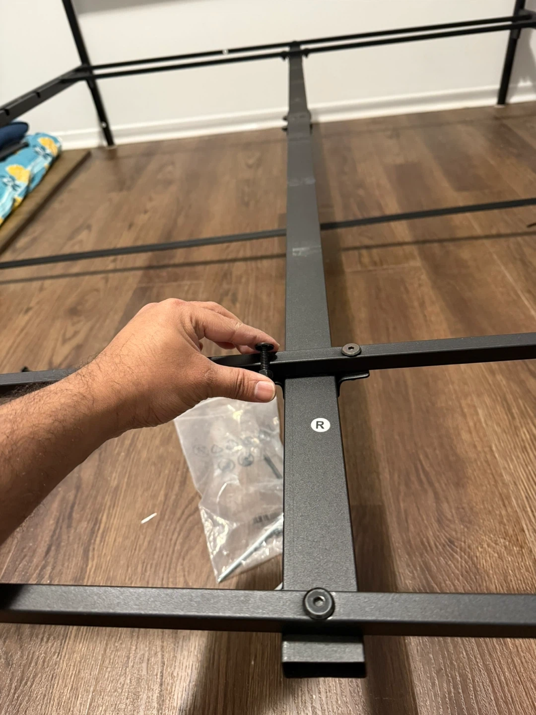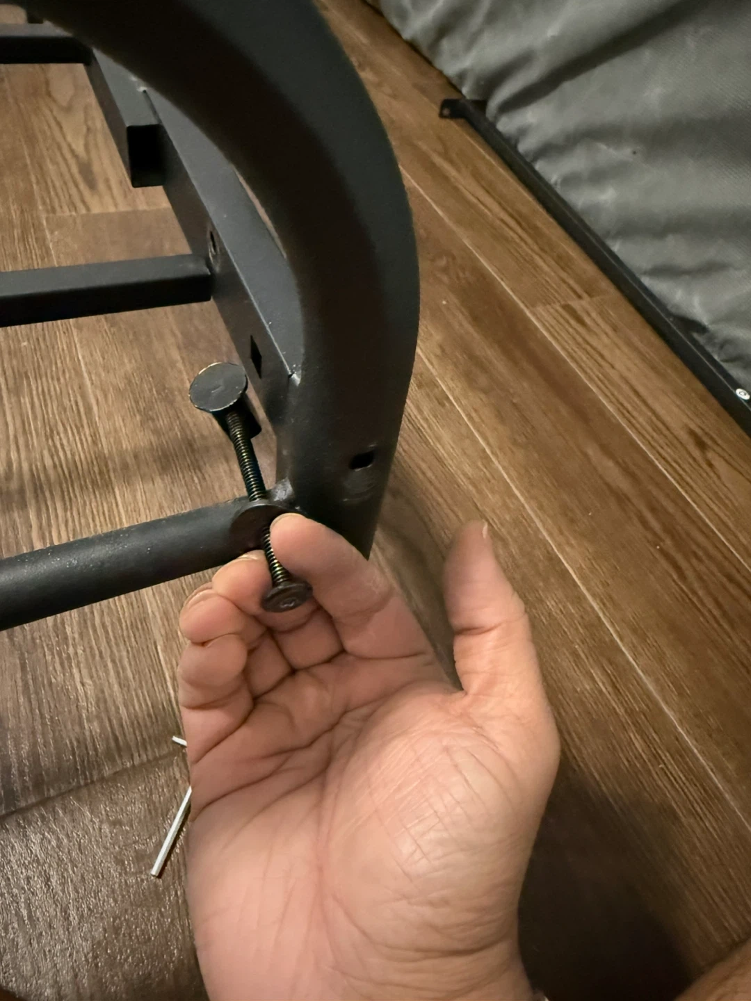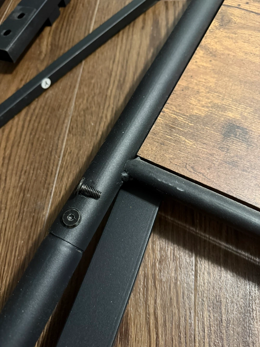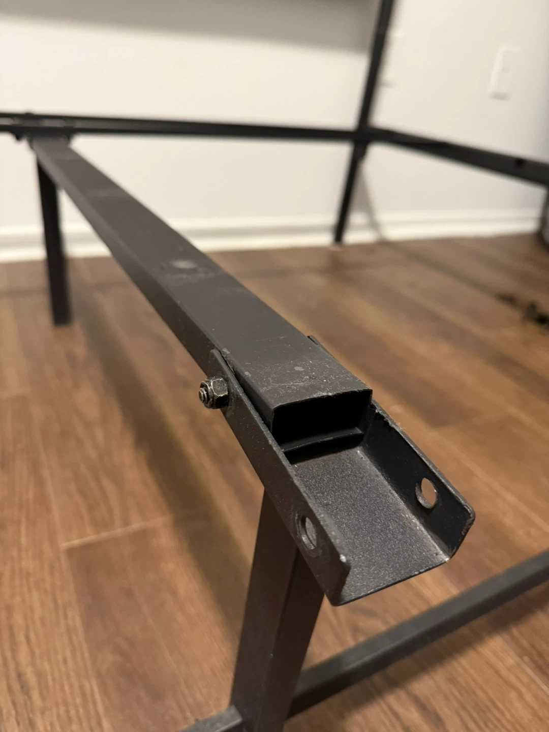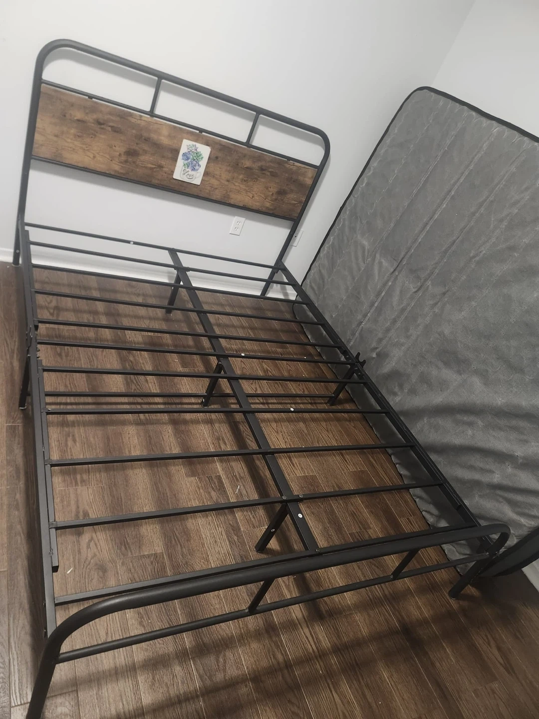 Queen-size metal bed frame with a modern industrial design. Strong steel slat base provides excellent support — no box. Headboard features a wood-finish accent that looks great in any bedroom.