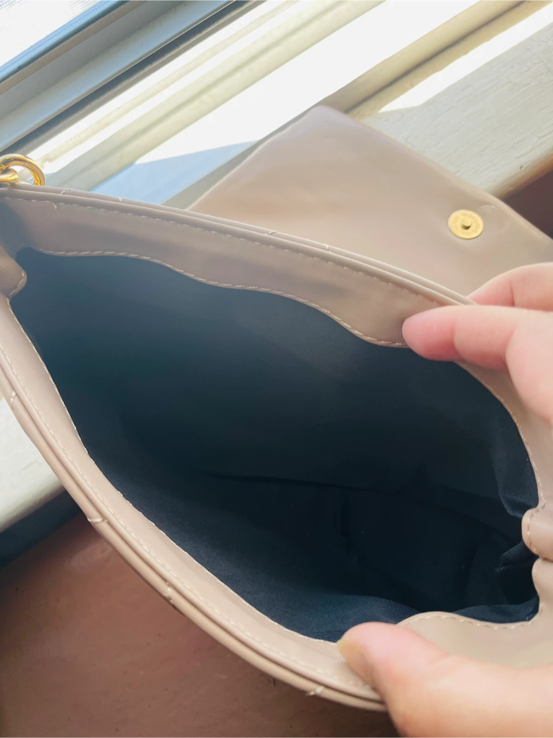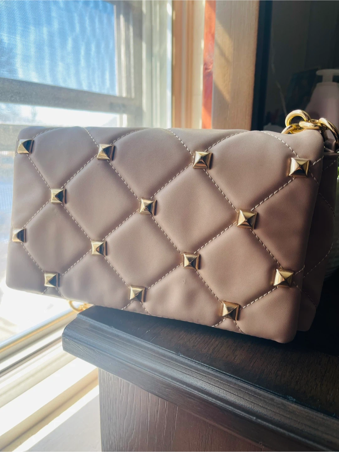 This stylish shoulder bag features a diamond-stitched quilting with gold pyramid studs. It has a secure snap closure and a gold chain strap. The interior is lined and includes a small pocket. Perfect for a night out!