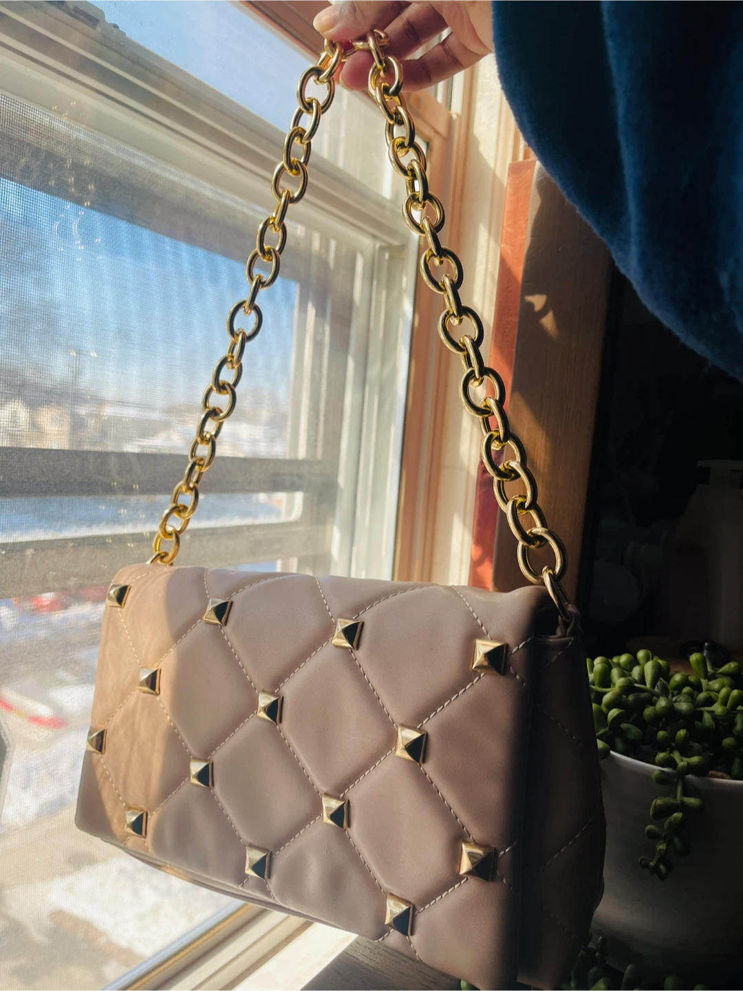 This stylish shoulder bag features a diamond-stitched quilting with gold pyramid studs. It has a secure snap closure and a gold chain strap. The interior is lined and includes a small pocket. Perfect for a night out!