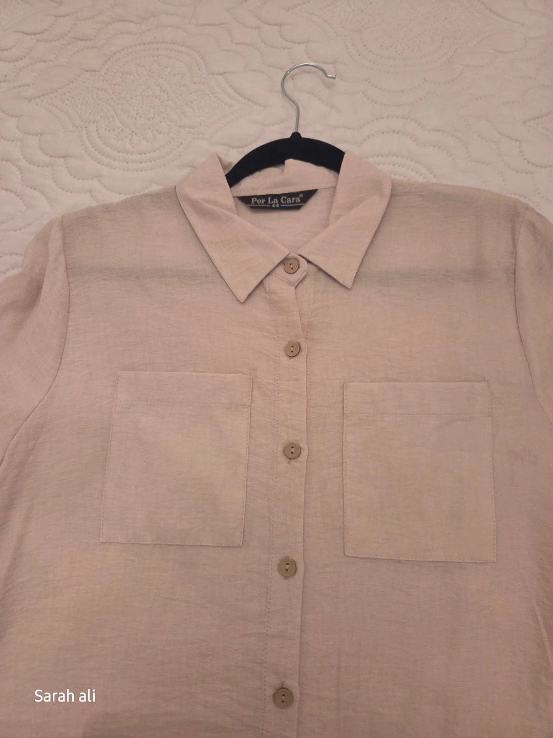 It's a beige button-up shirt from por La Cara, featuring two chest pockets and a relaxed fit. The fabric has a linen-like texture and it's lightweight for comfort. This shirt is suitable for casual wear or layering.