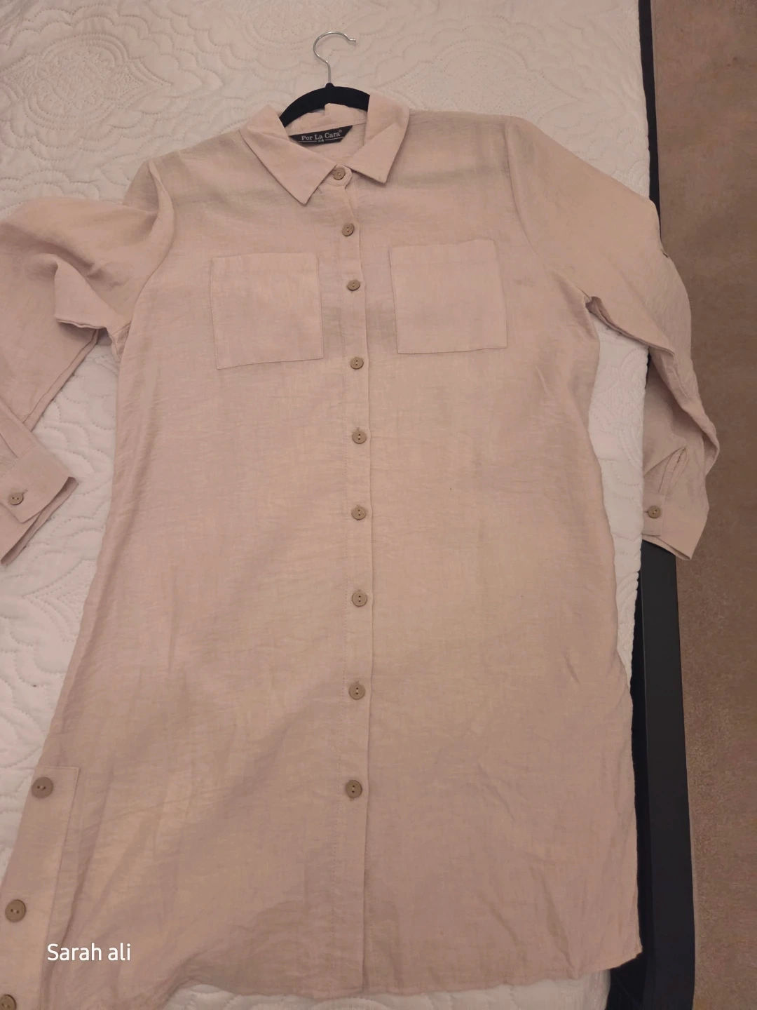 It's a beige button-up shirt from por La Cara, featuring two chest pockets and a relaxed fit. The fabric has a linen-like texture and it's lightweight for comfort. This shirt is suitable for casual wear or layering.