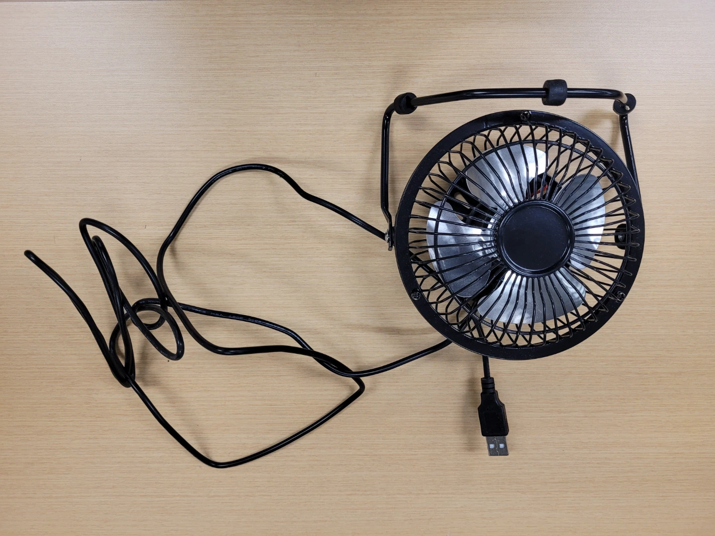 This is a portable black USB desk fan. It's powered by a USB cable, making it easy to plug into a computer or power bank. The fan has a sturdy metal grille and base for stability.