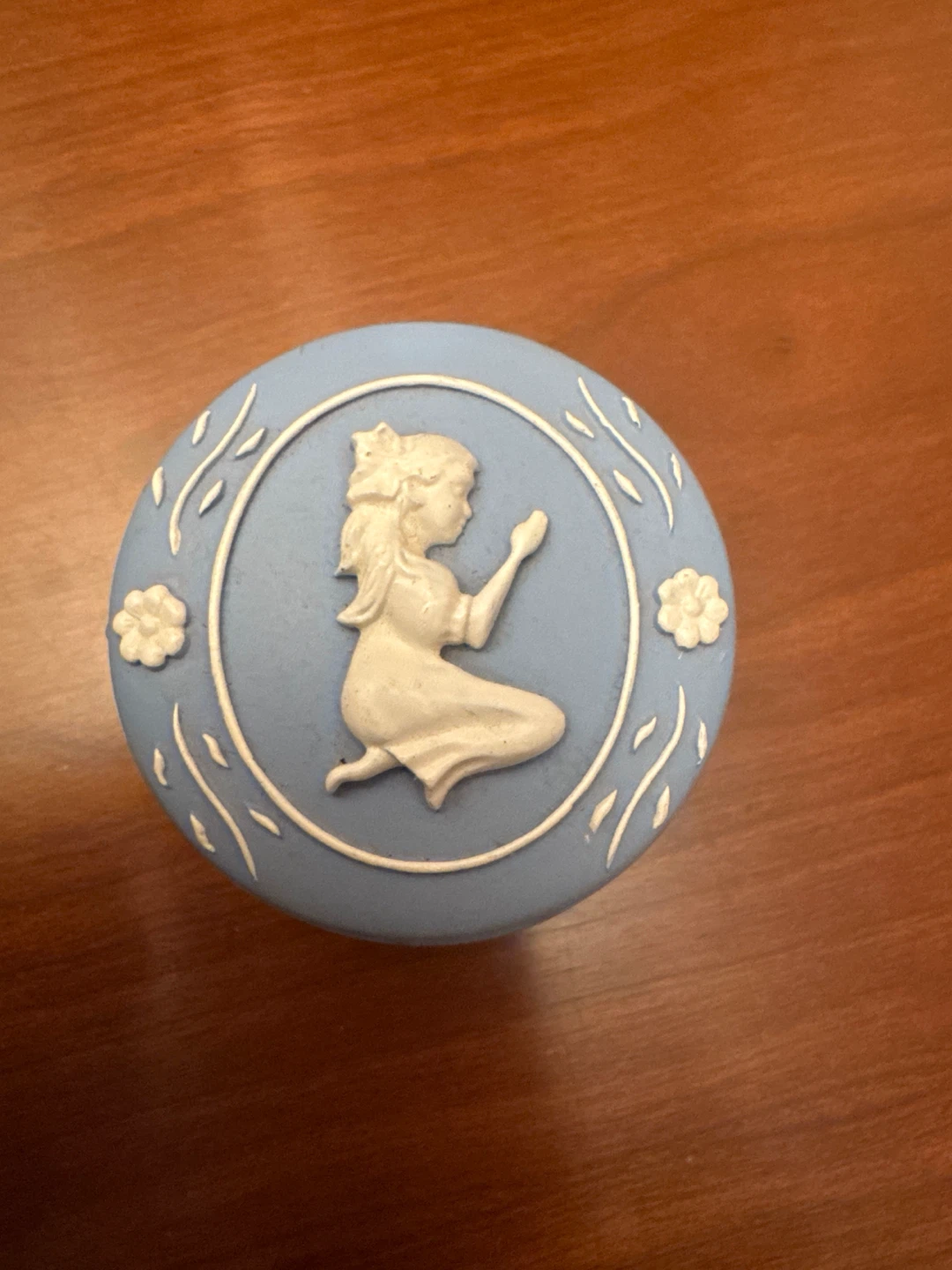This is a lovely blue vintage Wedgwood-style Jasperware trinket box. It features a classic cameo design on the lid. A nice piece for storing small treasures!