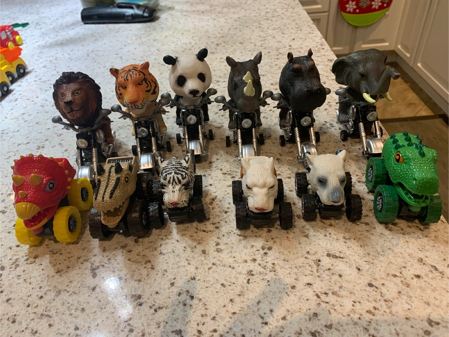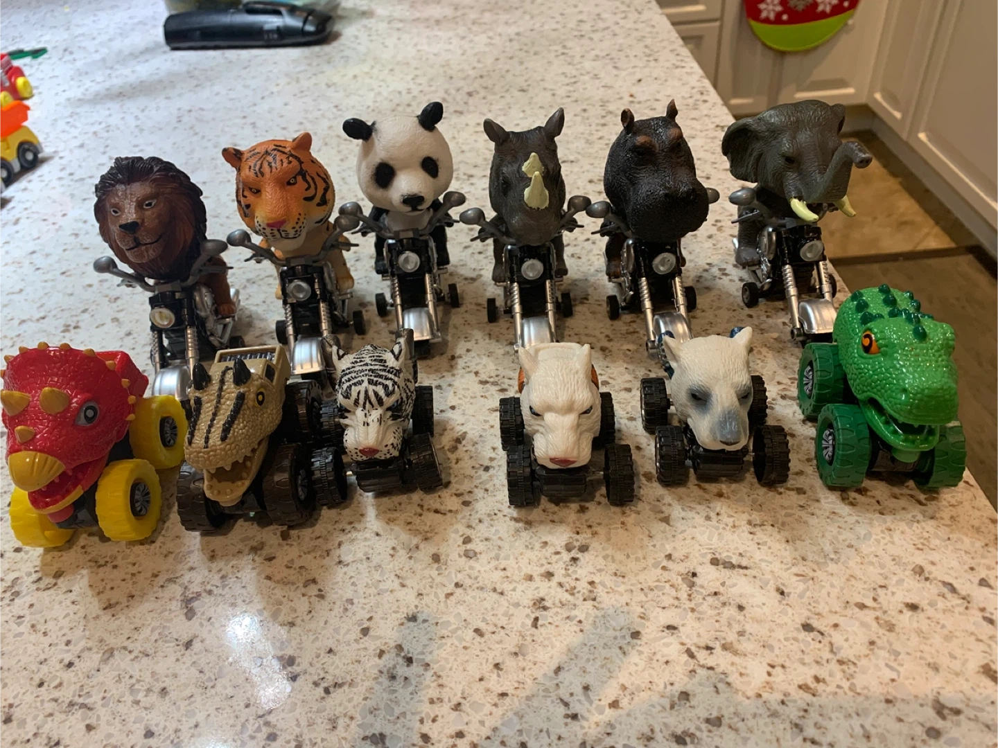 Selling a collection of animal-themed toy motorcycles and cars! There are ten in total, featuring a variety of animals like a lion, tiger, panda, rhino, elephant, and dinosaurs. They're in great condition and ready for a new adventure!