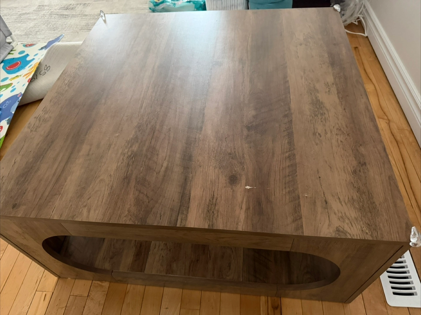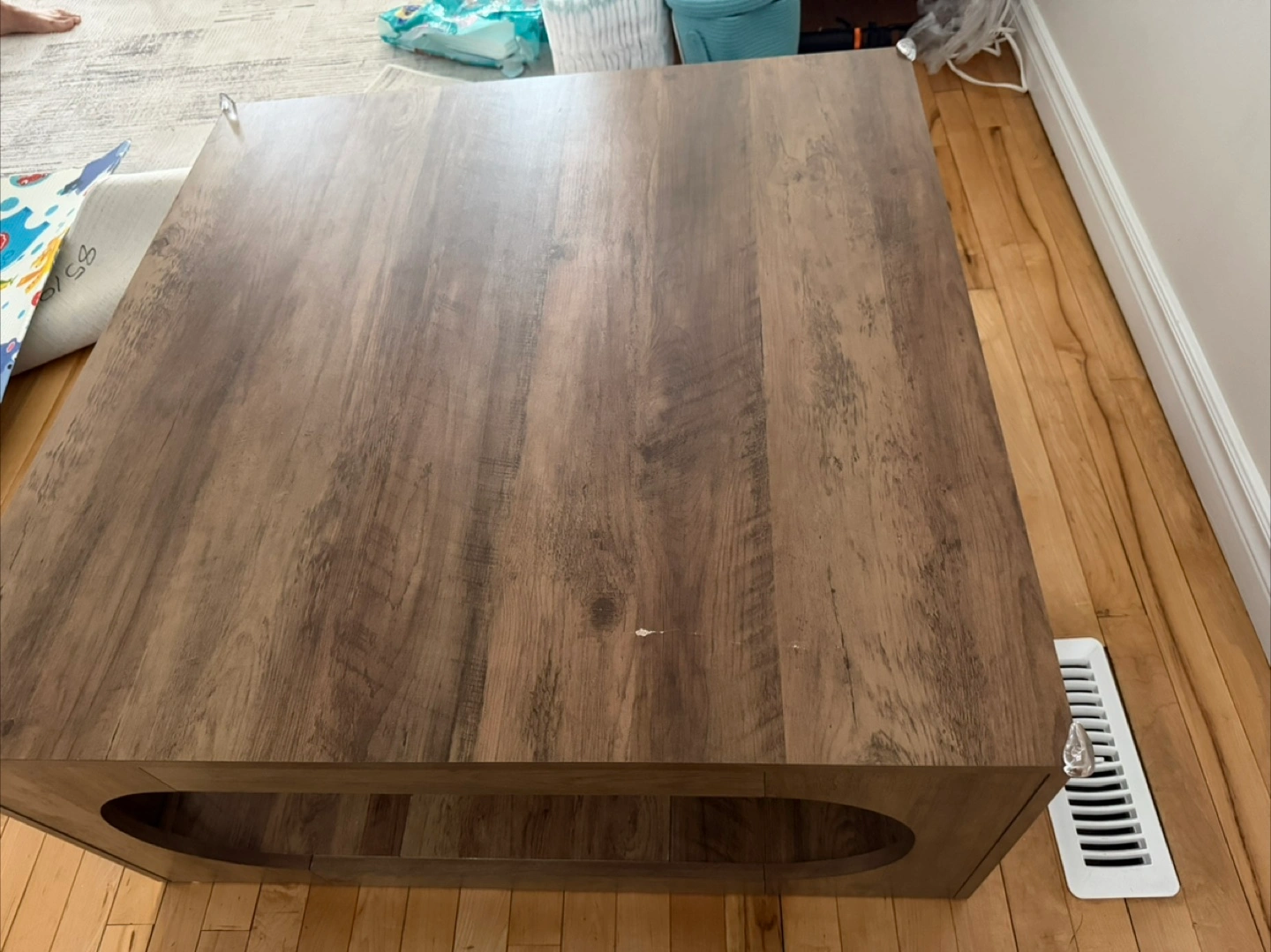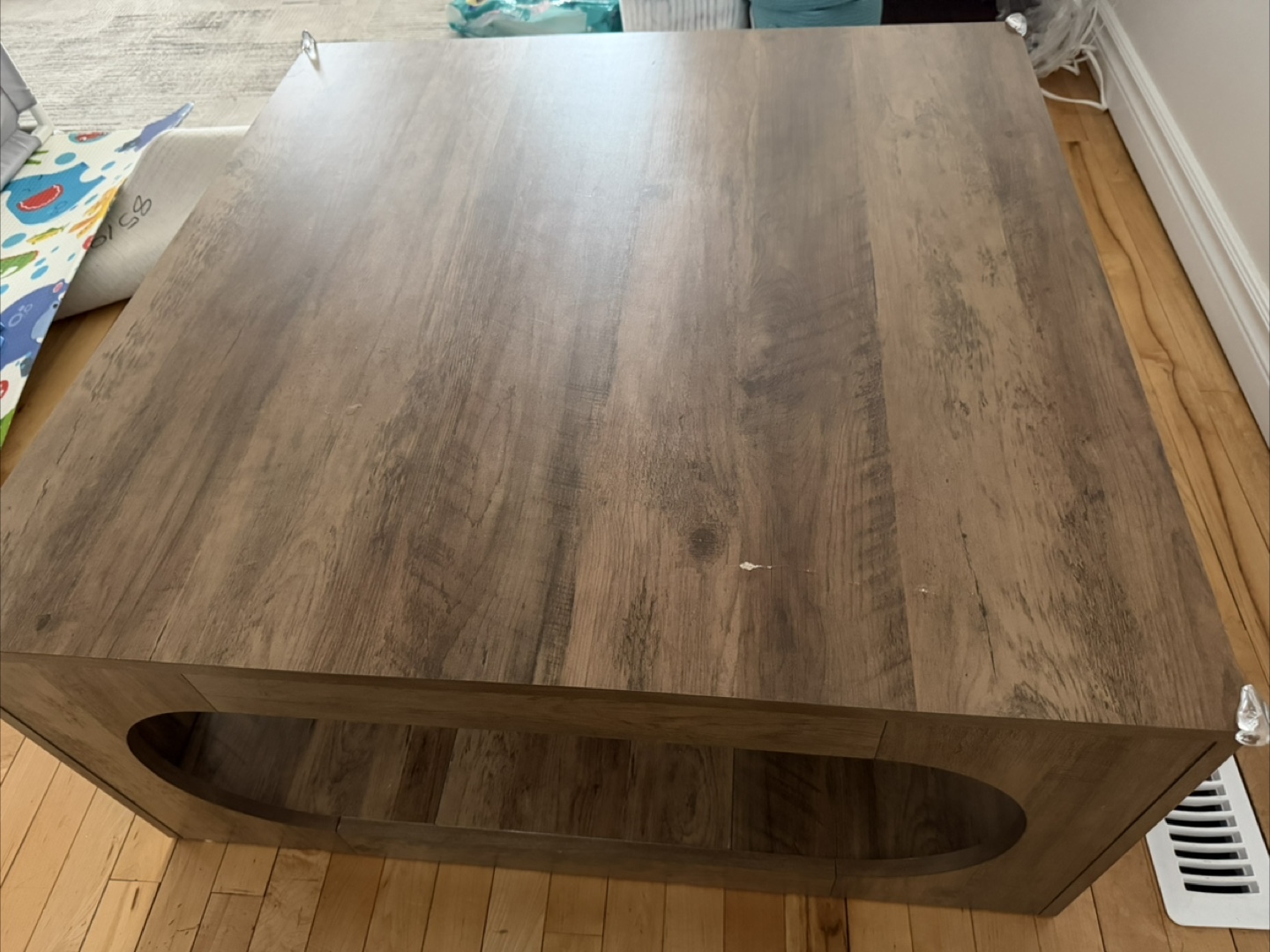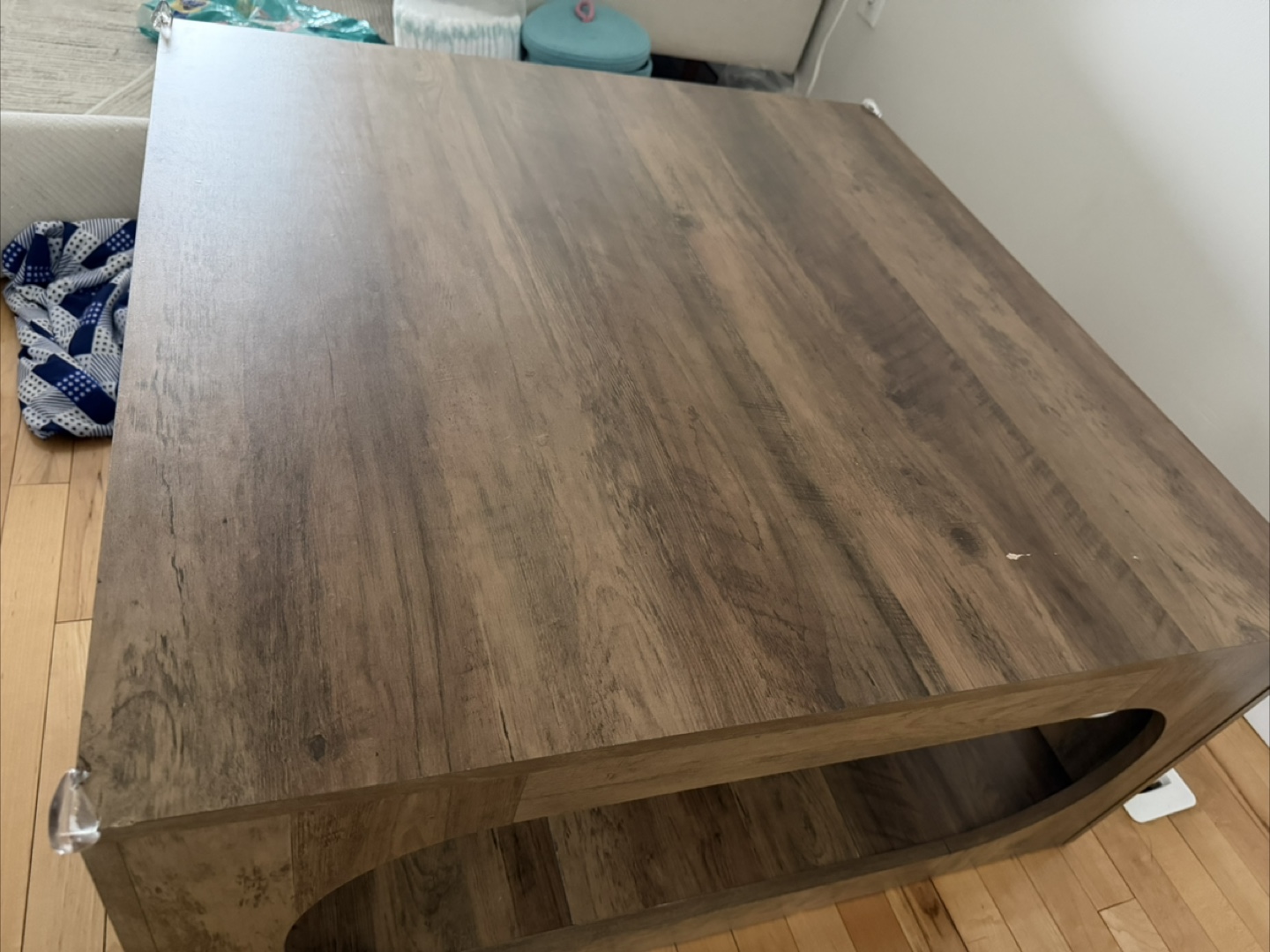 A modern coffee table with a wood-look finish. It features an open shelf for storage or display. This table's unique, curved sides add a stylish touch to any living room.
