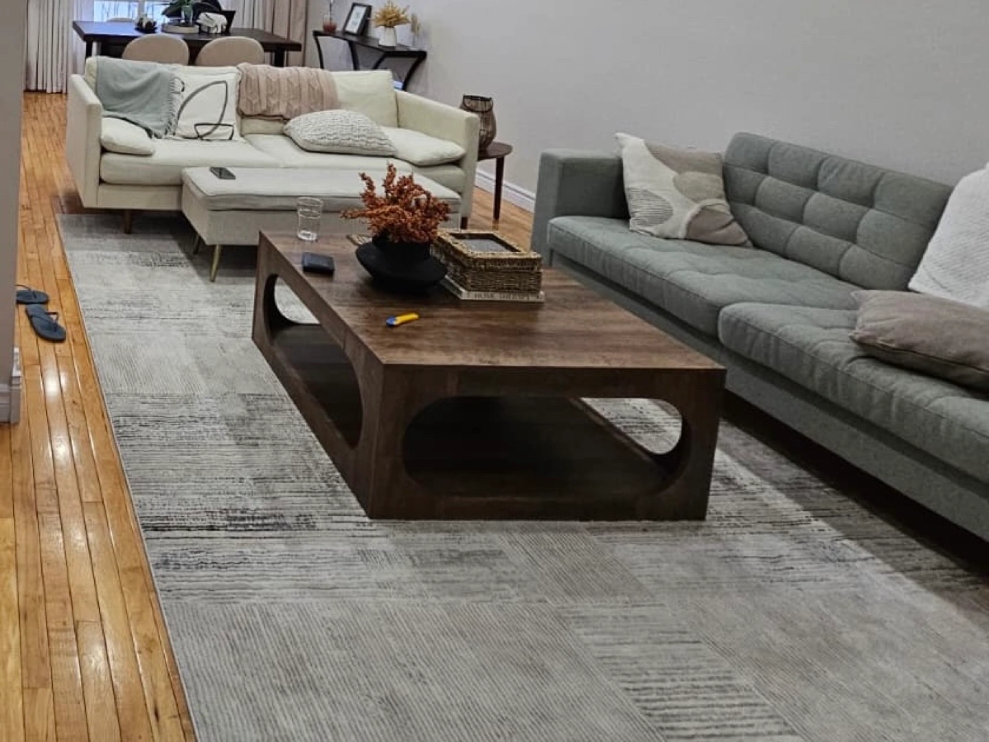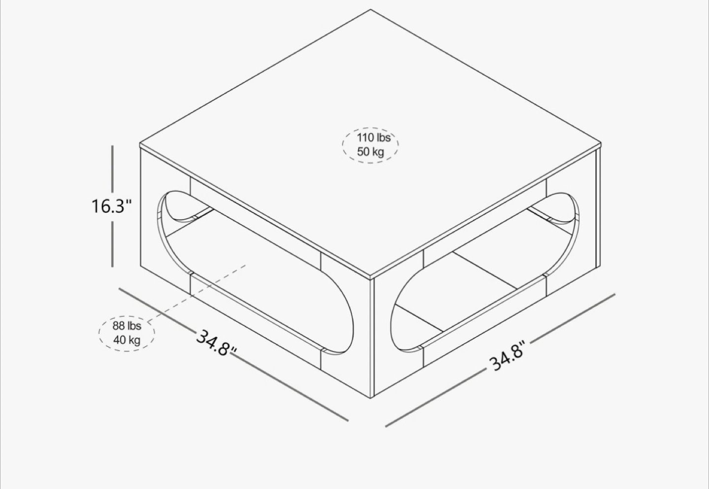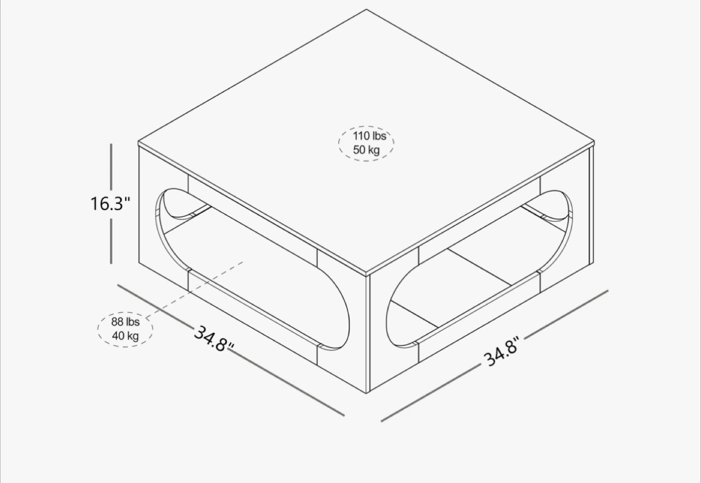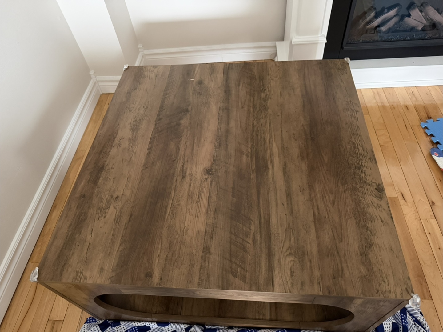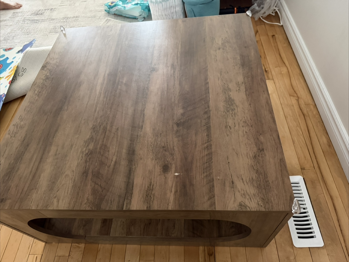 A modern coffee table with a wood-look finish. It features an open shelf for storage or display. This table's unique, curved sides add a stylish touch to any living room.
