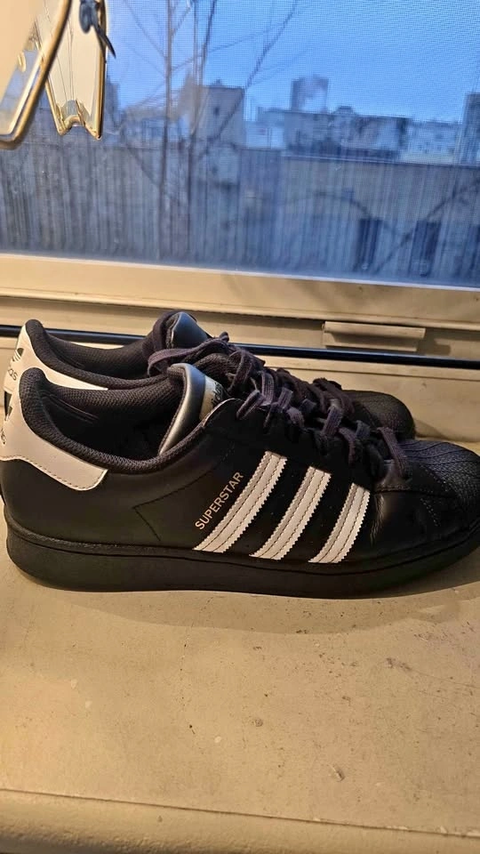 Classic black Adidas Superstar sneakers with the iconic shell-toe design.