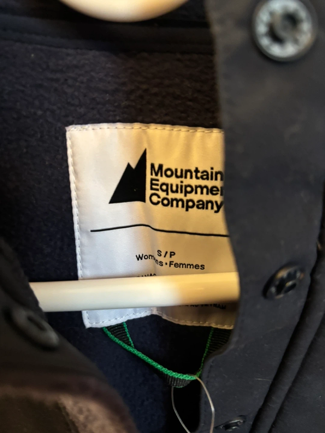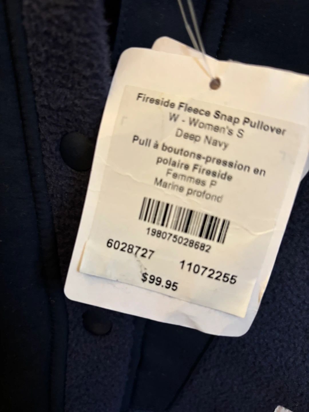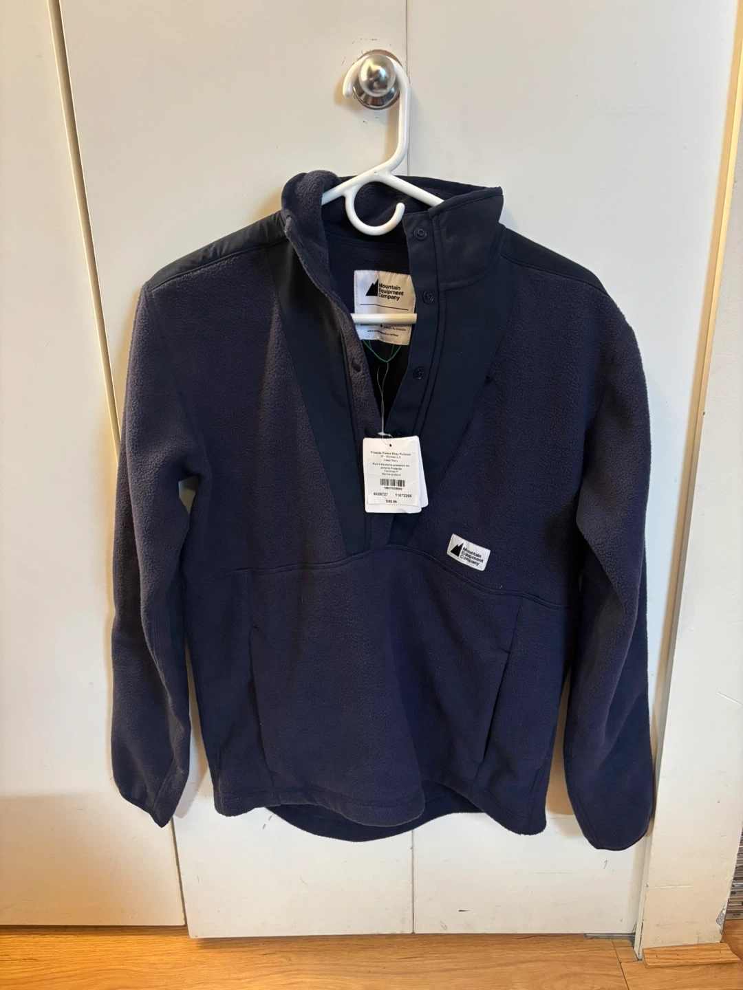 This is a Mountain Equipment Company Fireside Fleece Snap Pullover for women in size small. It's a deep navy colour. The pullover is made from fleece material and features a snap closure.