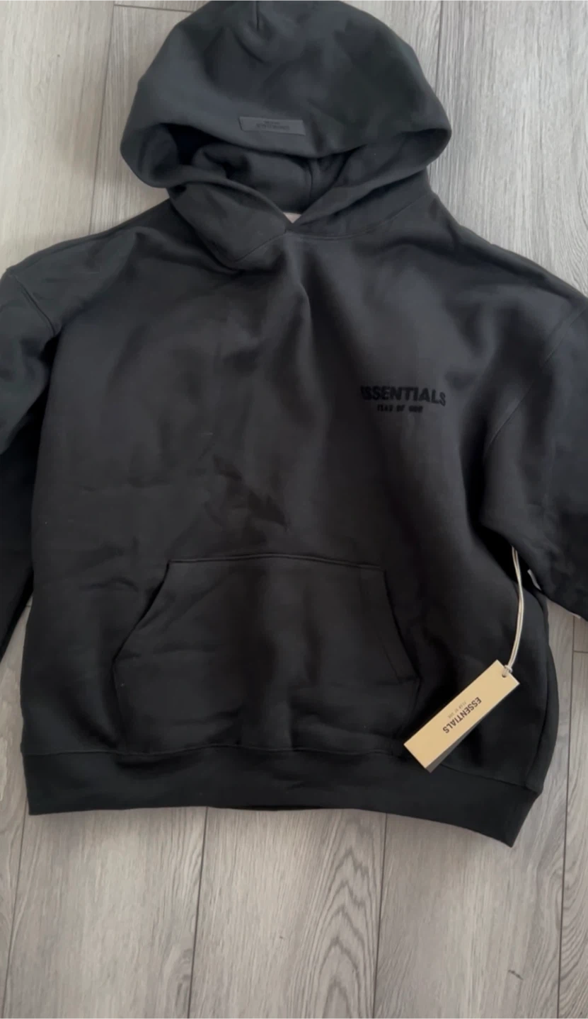 This is an Essentials Fear of God hoodie. It's a pullover style with a front pouch pocket and a hood. The "essentials" logo is printed on the back and "FEAR OF GOD" is underneath.