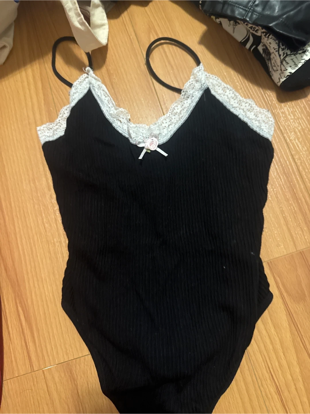 A black ribbed bodysuit with delicate white lace trim along the neckline. Features adjustable spaghetti straps and a small pink bow accent. Material is a stretchy ribbed knit.