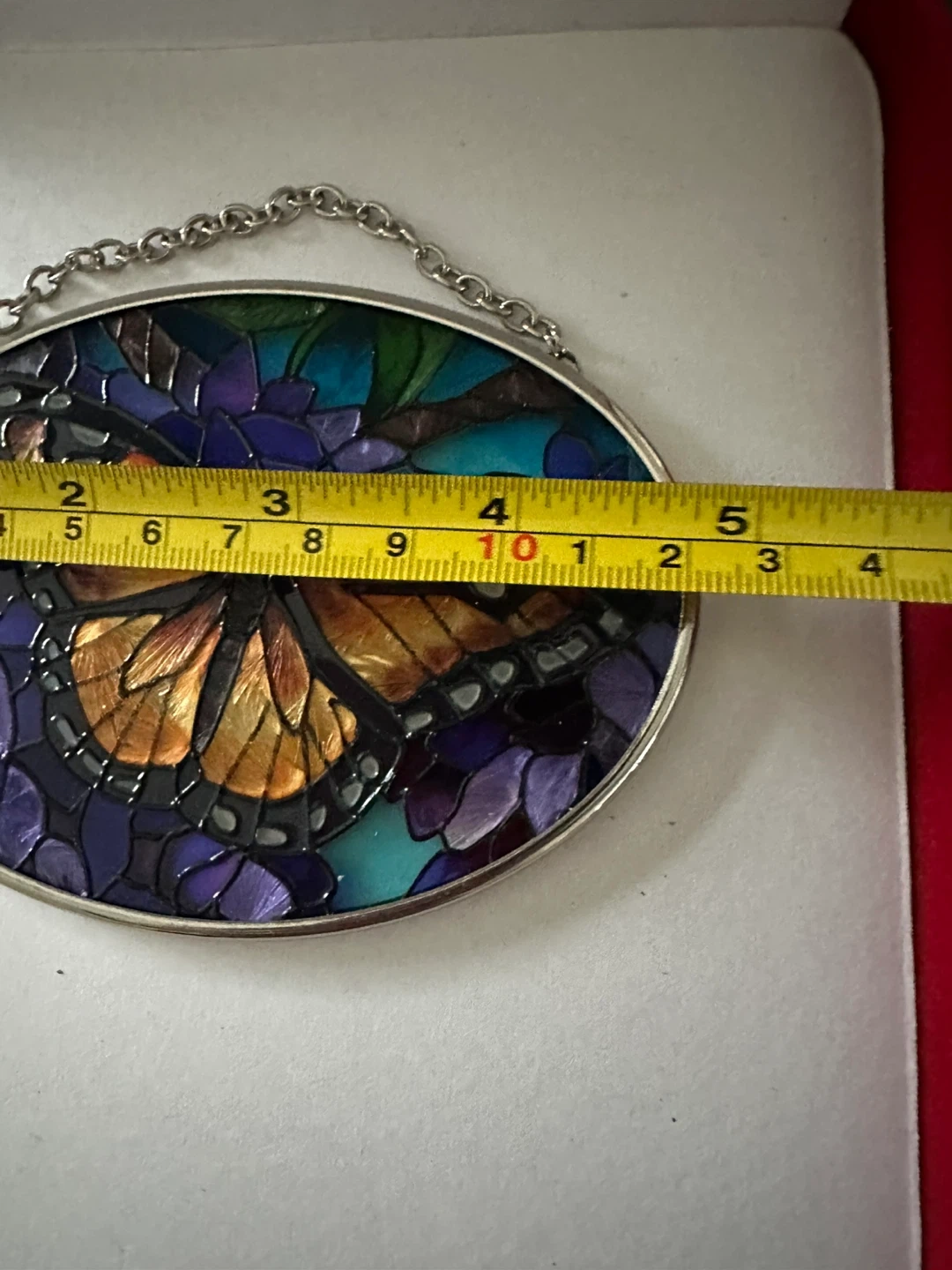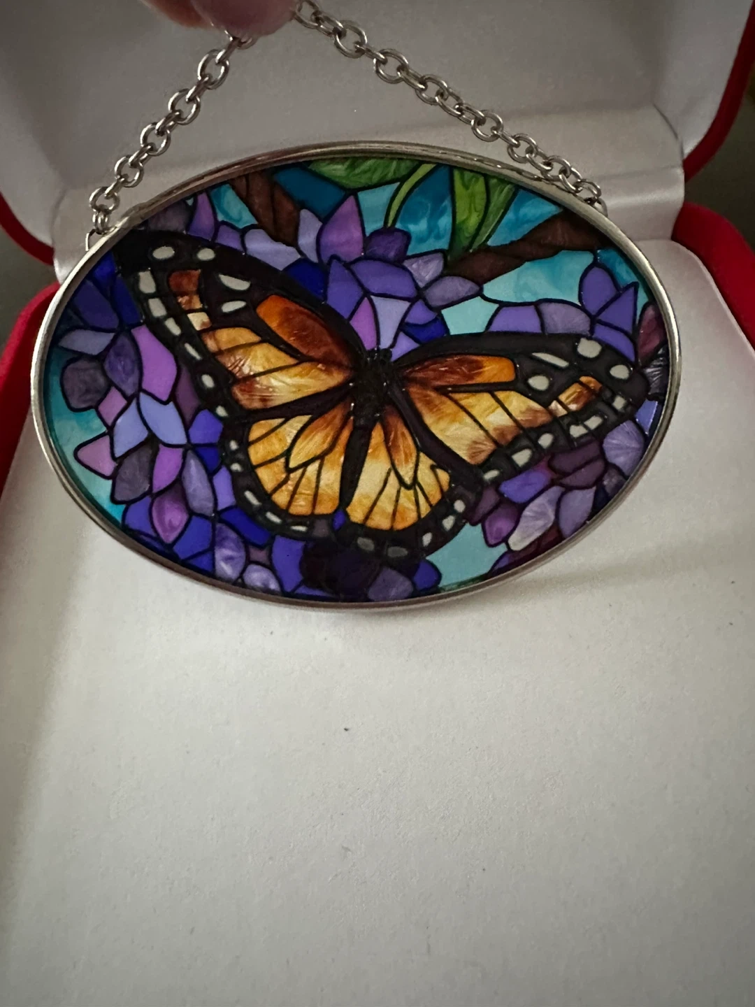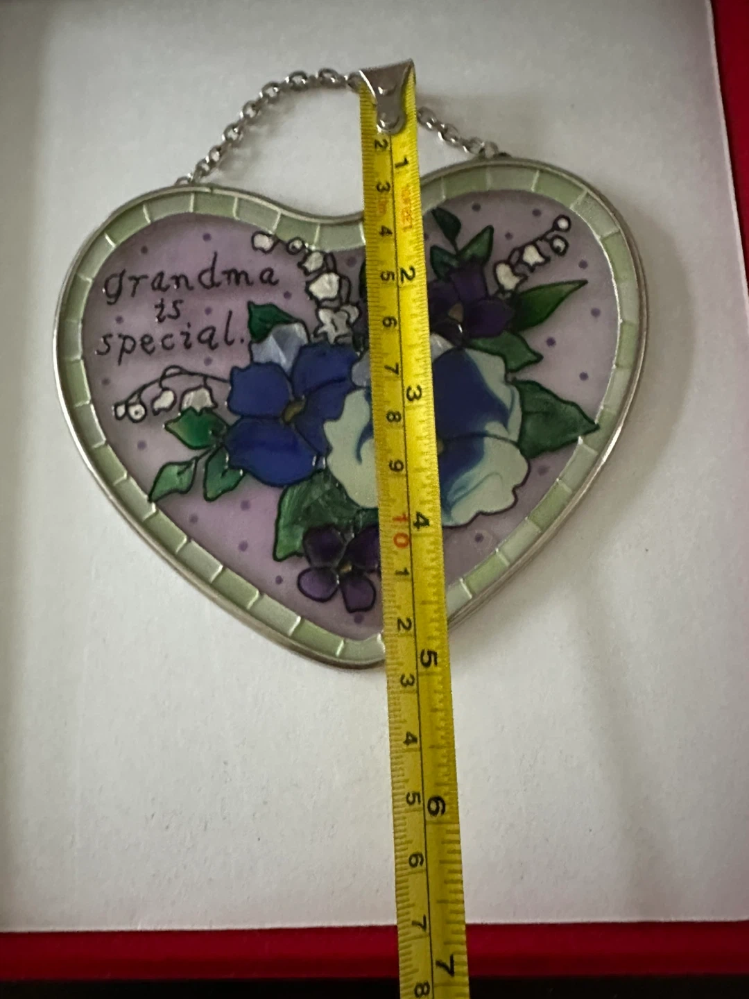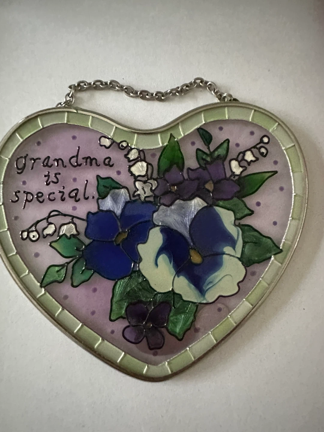 Two decorative glass suncatchers. One features a monarch butterfly design Sold and the other is a heart-shaped piece with flowers that says "Grandma is special." Each includes a hanging chain.