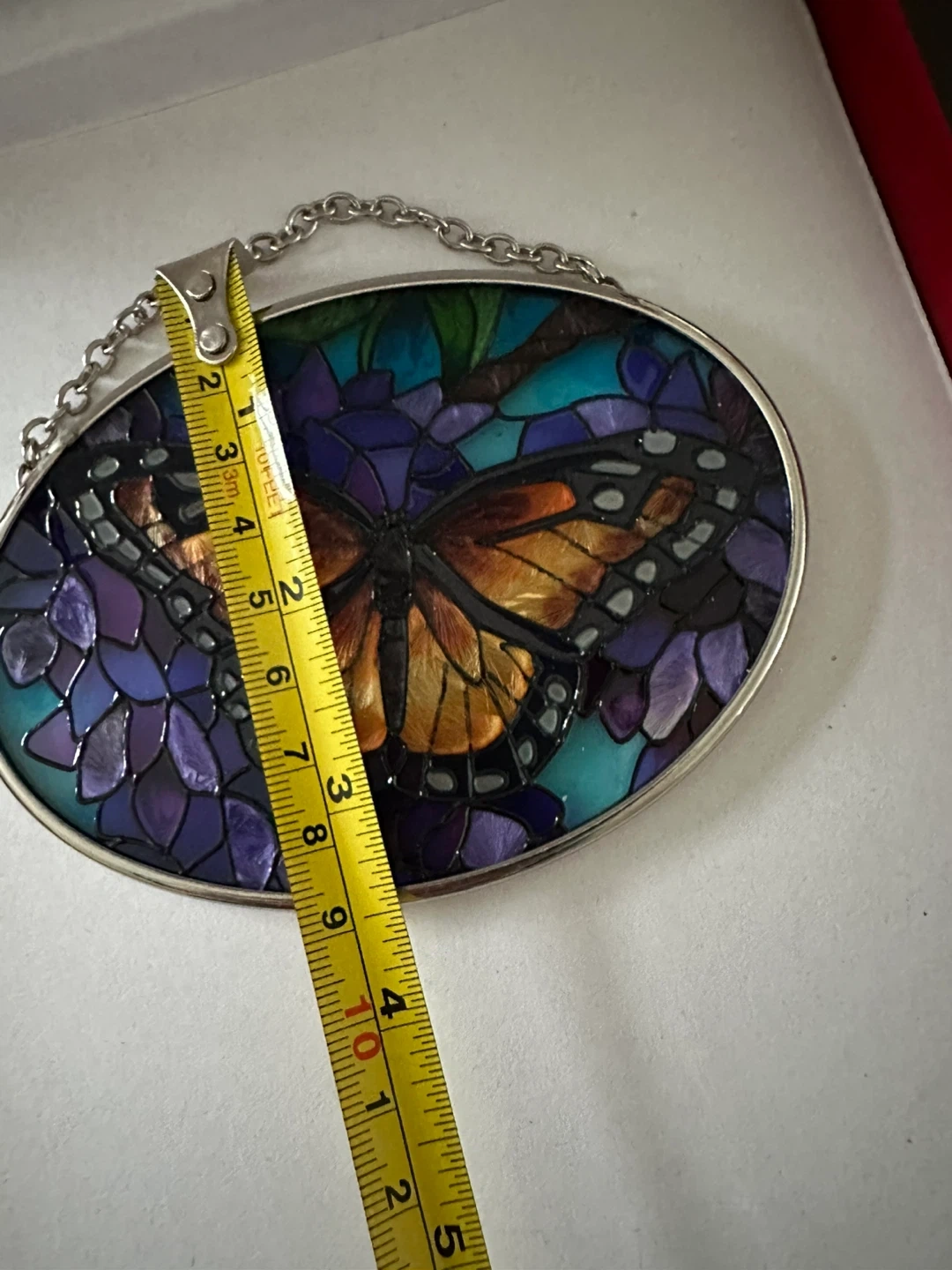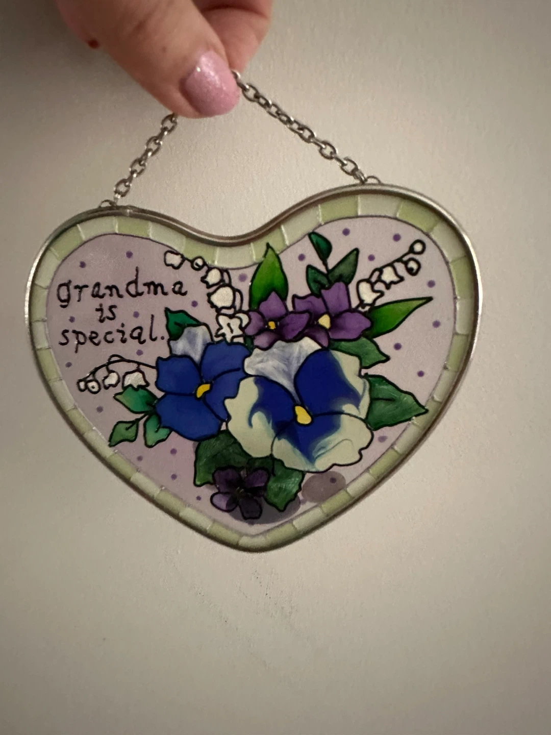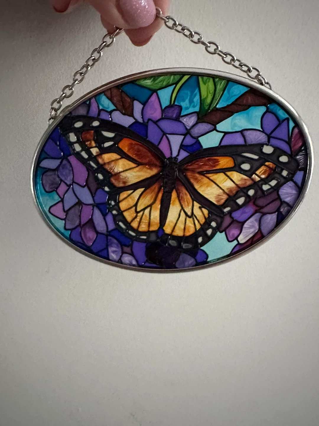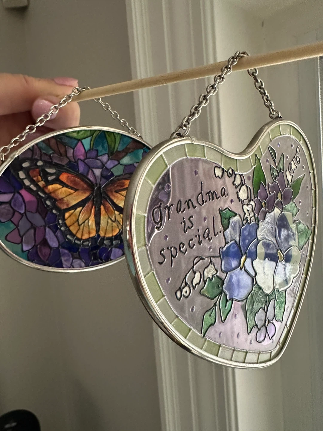 Two decorative glass suncatchers. One features a monarch butterfly design Sold and the other is a heart-shaped piece with flowers that says "Grandma is special." Each includes a hanging chain.
