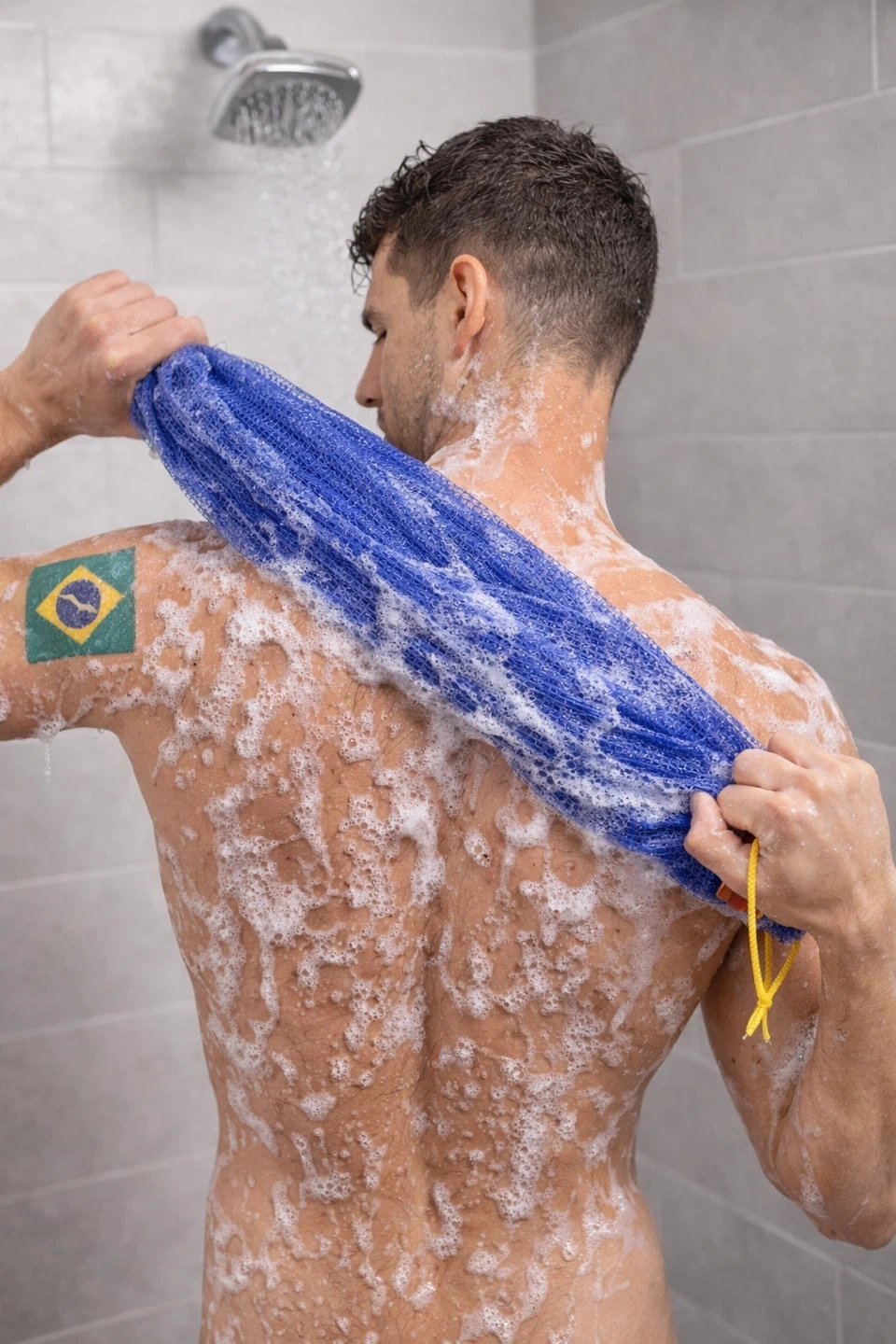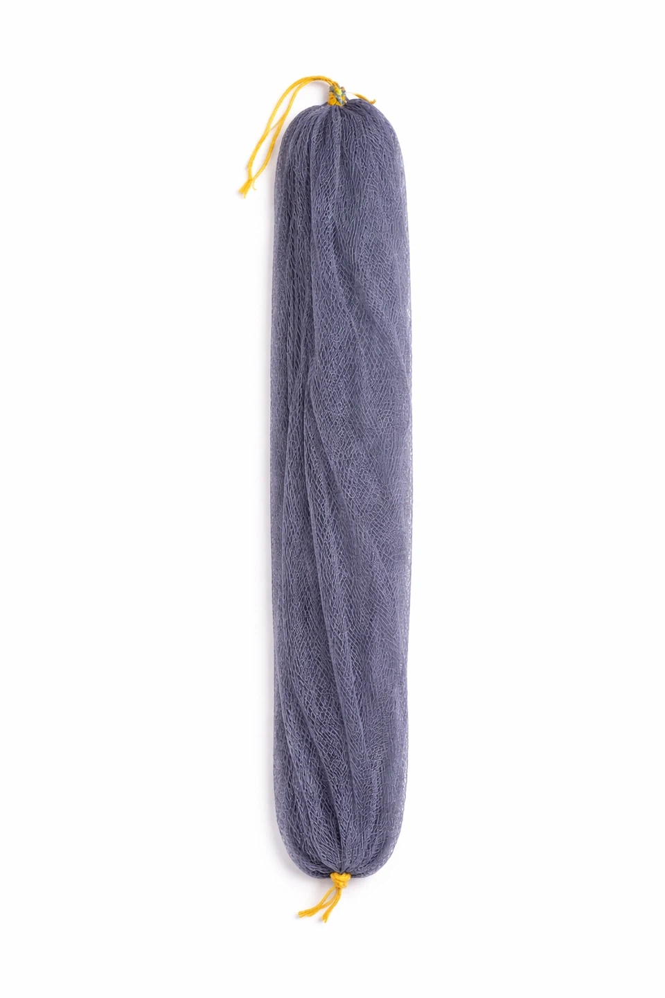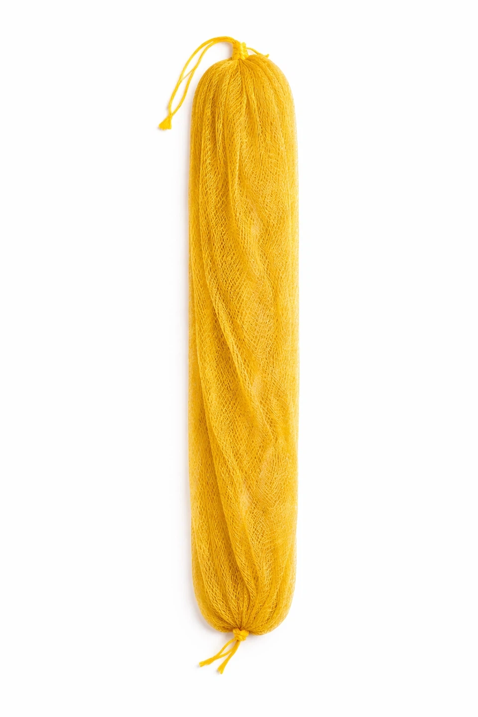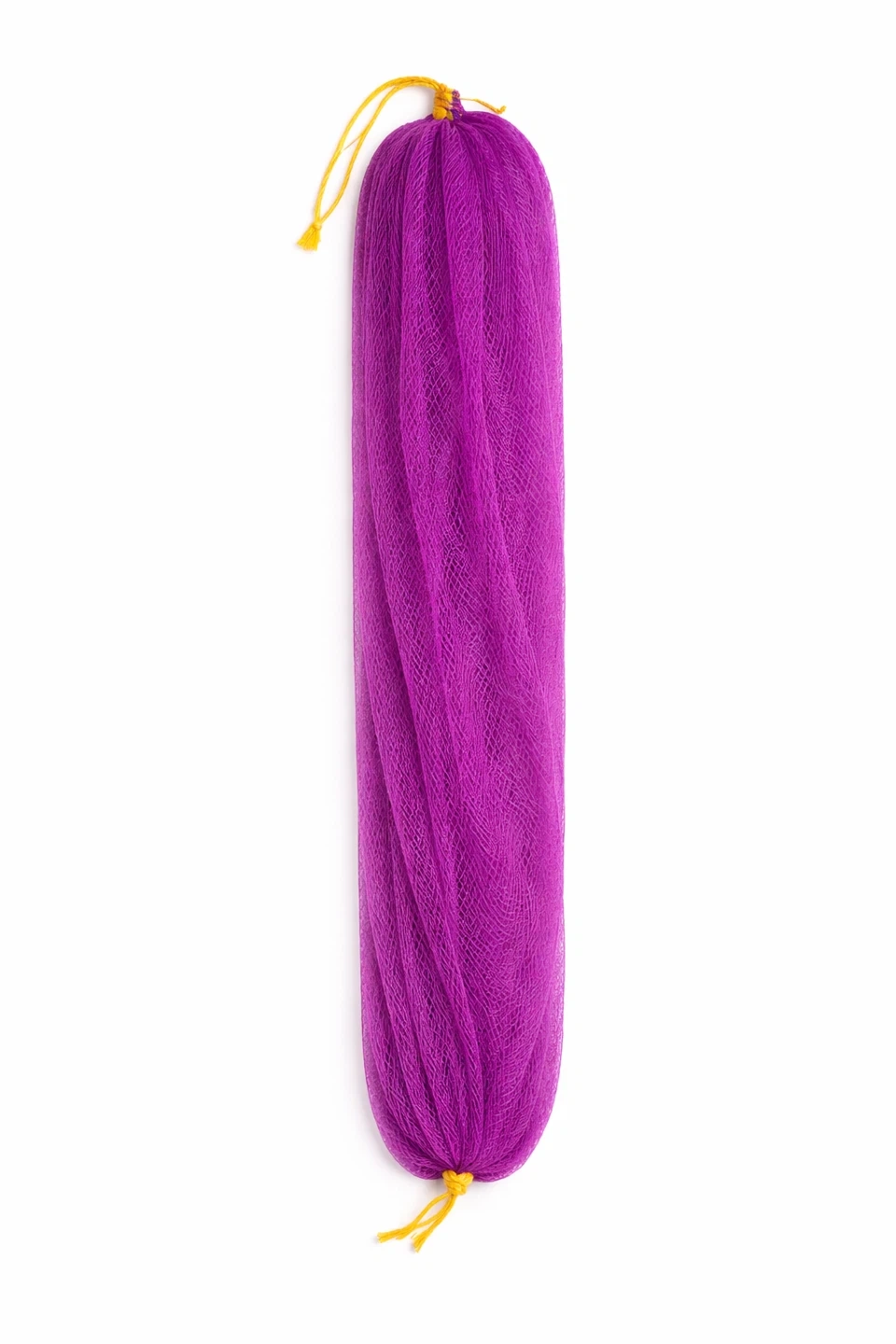 This long mesh bath sponge is 31.5 inches (80 cm) long. It's made of mesh material and includes a yellow drawstring. It's great for reaching your back while showering.