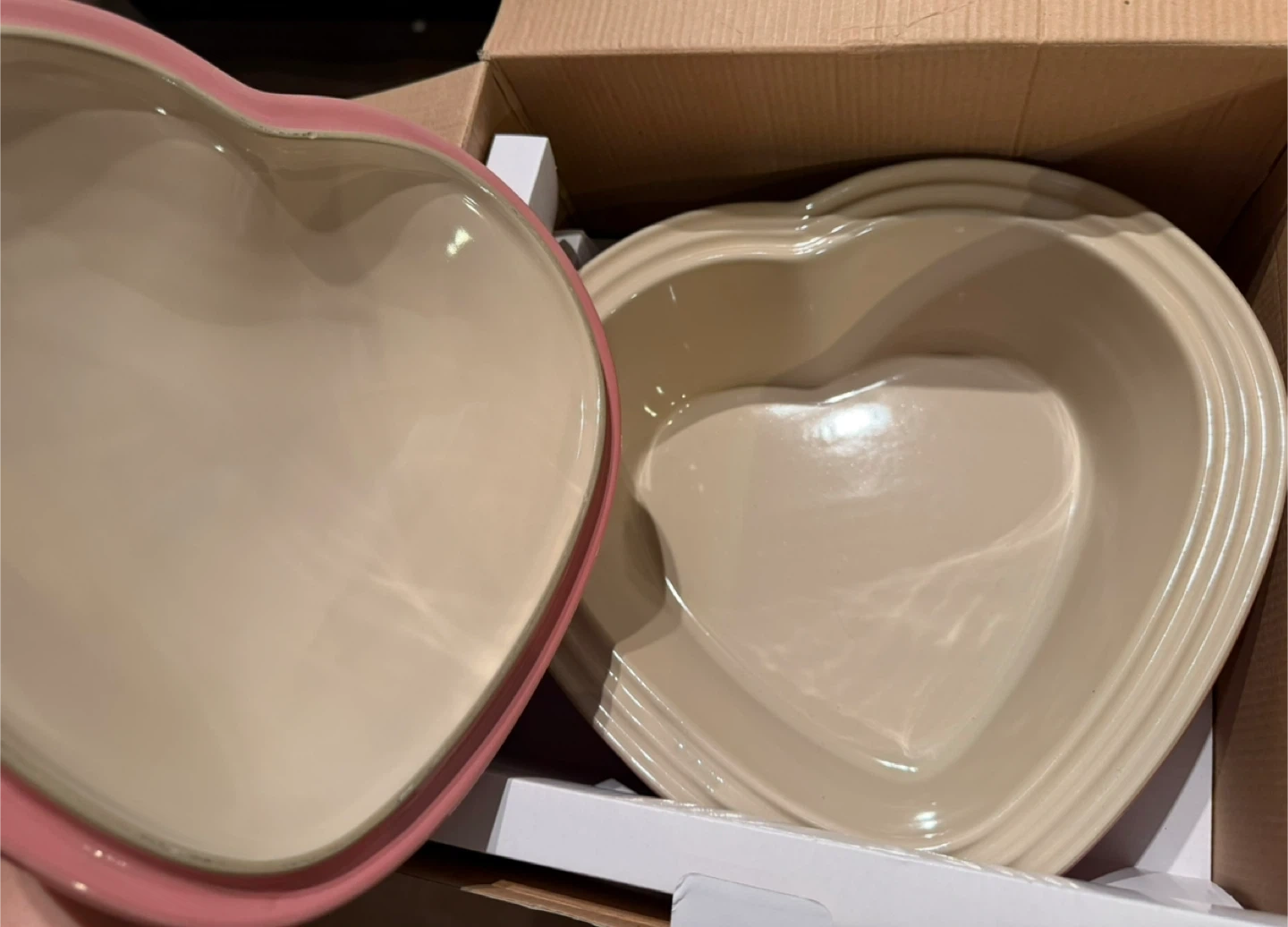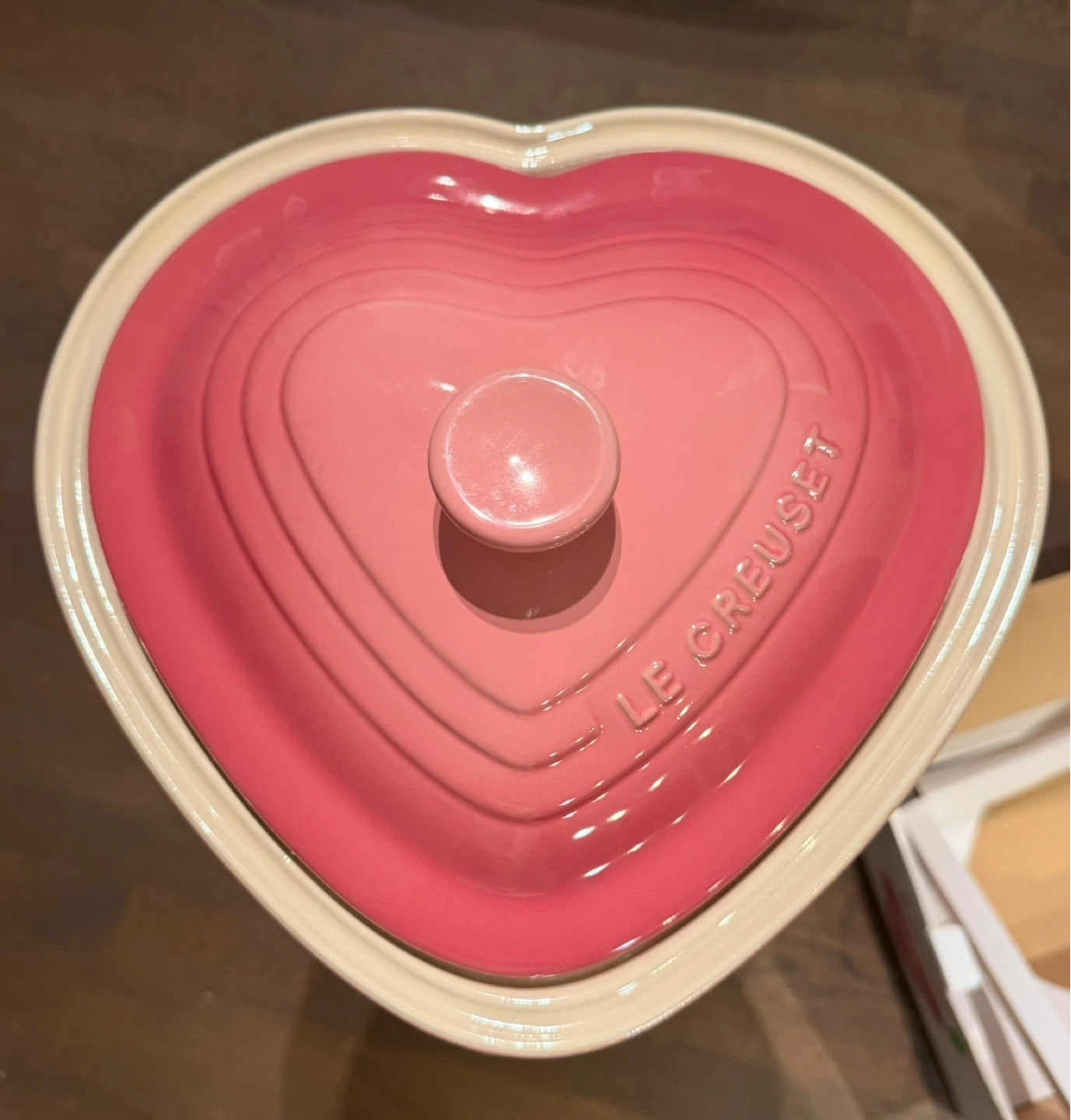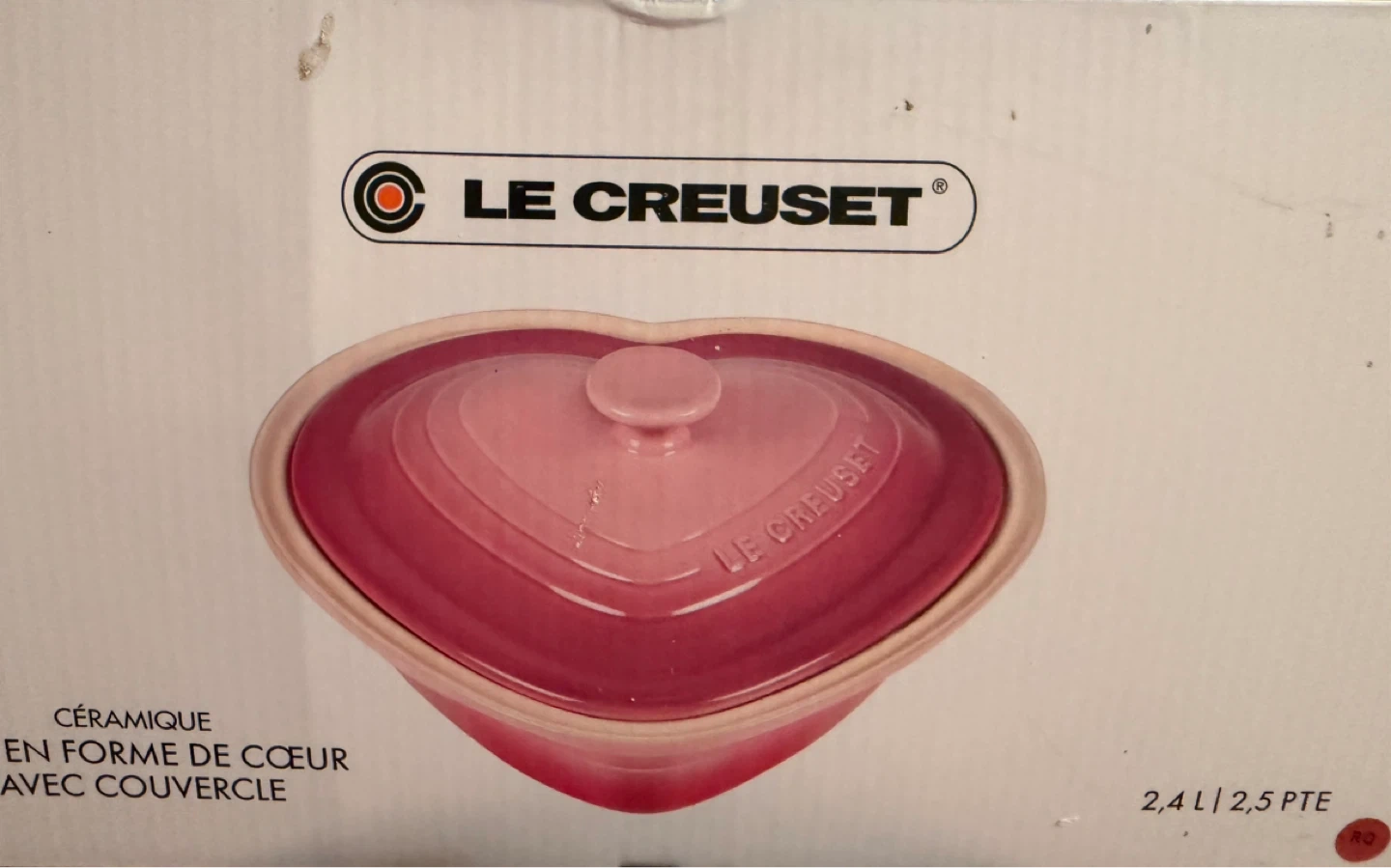 Le Creuset stoneware heart casserole with lid. Dishwasher, microwave, freezer safe and suitable for oven use up to 260°C/500°F. Resists staining, chipping, and cracking.