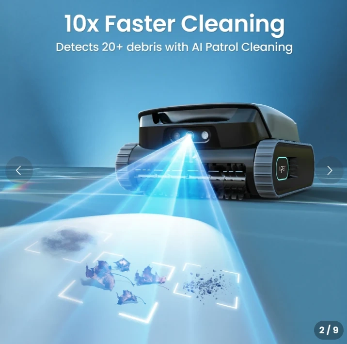 10x Faster Pool Cleaning with AI Patrol System: Single front-facing AI camera detects over 20 debris types and navigates directly to debris. It cleans up to ten times faster than traditional methods for efficient, energy-saving pool floor cleaning.