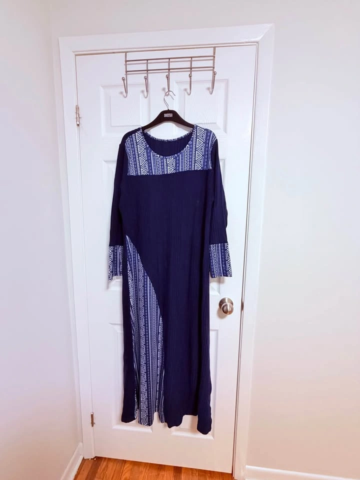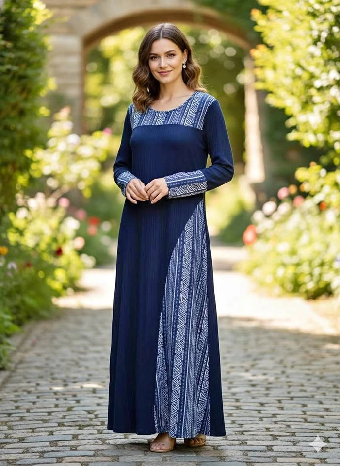 This stunning navy blue maxi dress features beautiful geometric tribal-patterned panels on the yoke, sleeves, and side. The ribbed fabric gives it a high-quality feel and a flattering drape.
