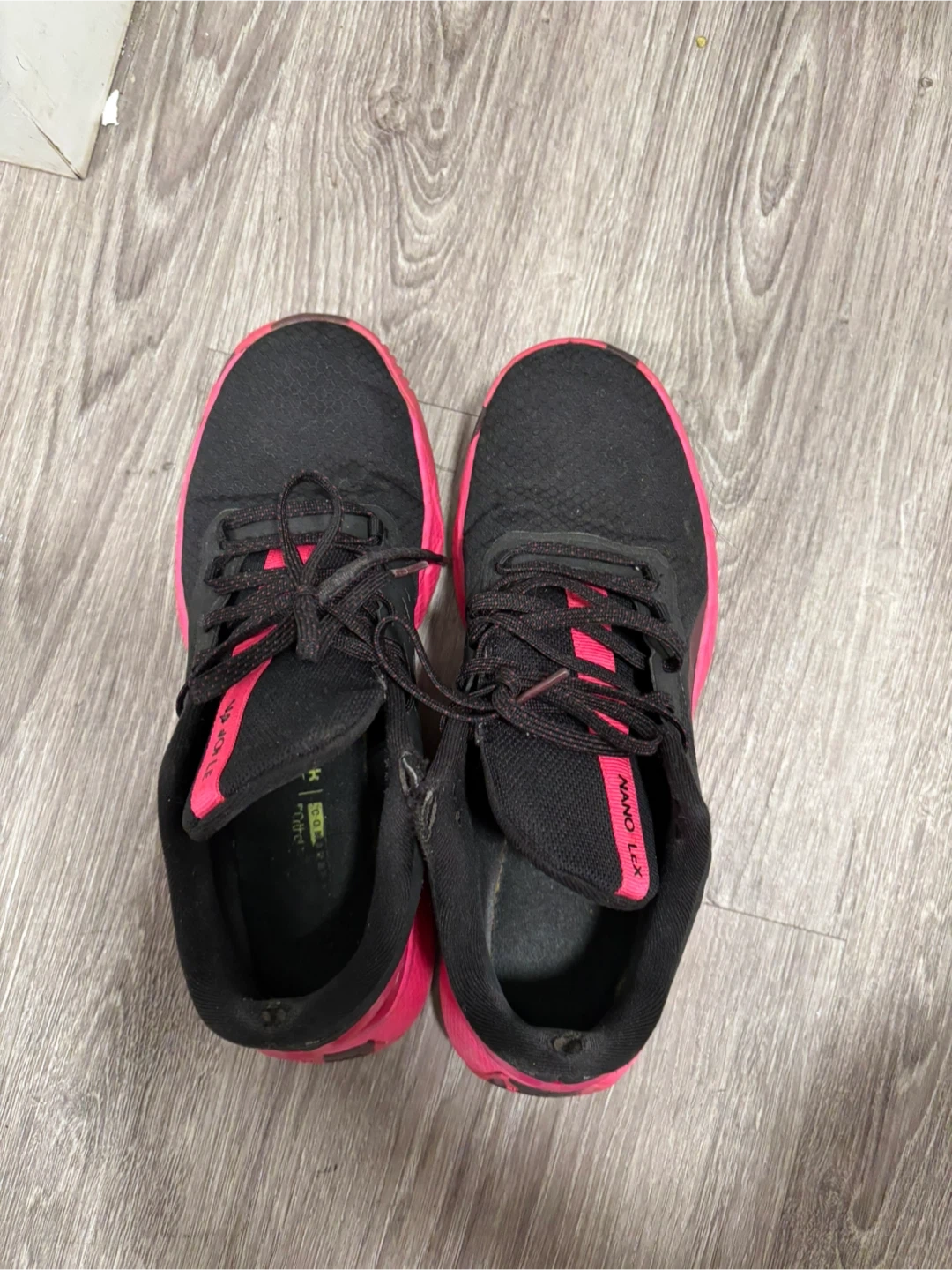 Selling a pair of Reebok Nano Lex training shoes in black with pink accents. They're in good used condition and ready for a new home! Perfect for your next workout