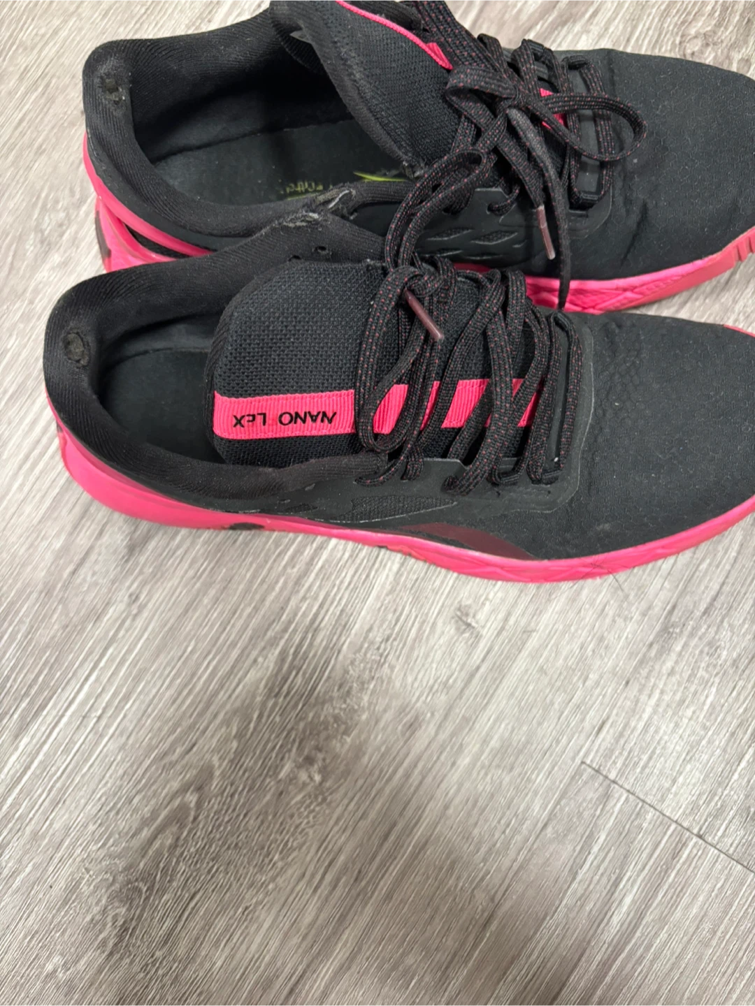 Selling a pair of Reebok Nano Lex training shoes in black with pink accents. They're in good used condition and ready for a new home! Perfect for your next workout