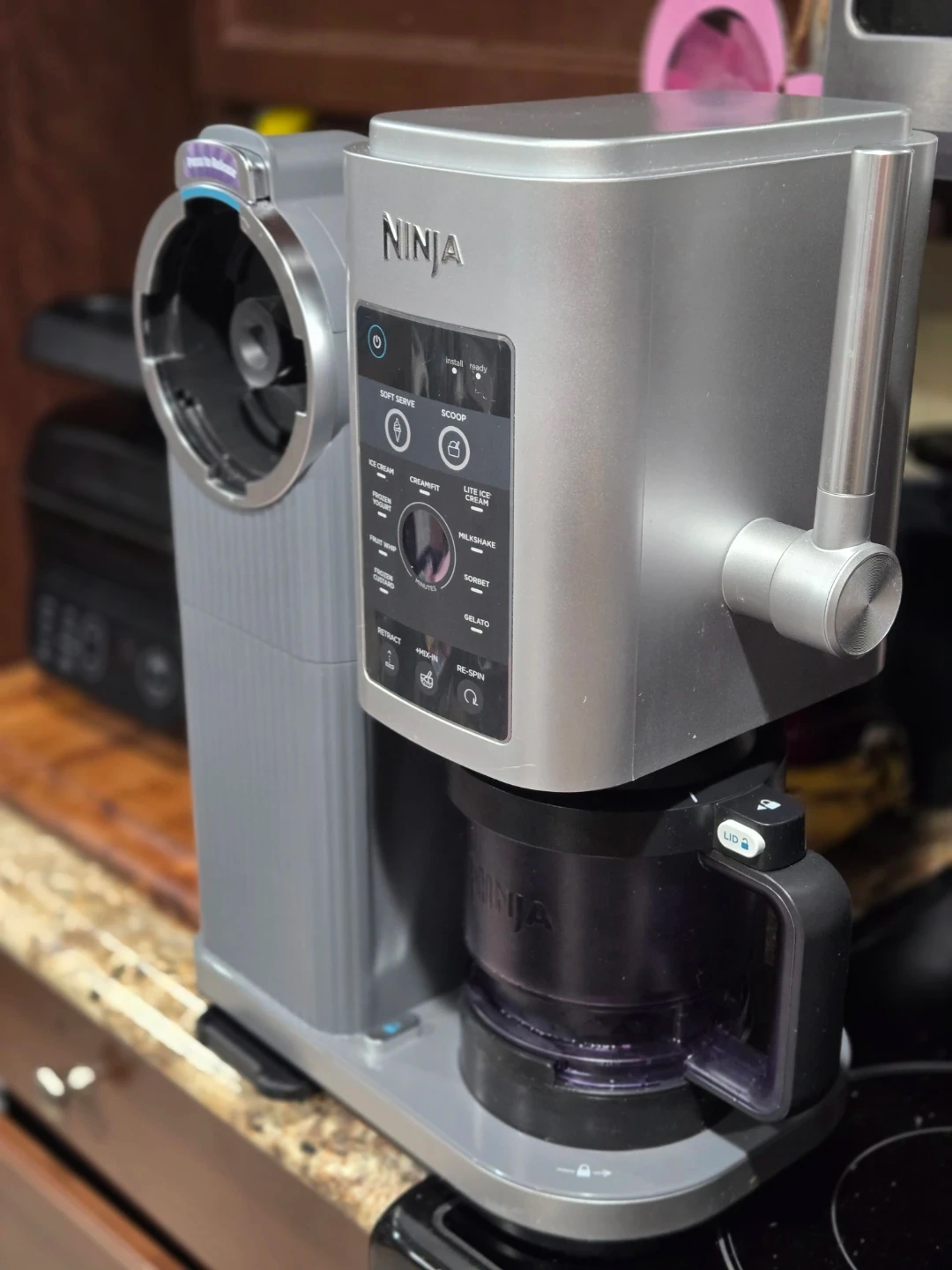Ninja CREAMi ice cream maker! It makes soft serve, ice cream, gelato, milkshakes, and more. Great for creating custom frozen treats.