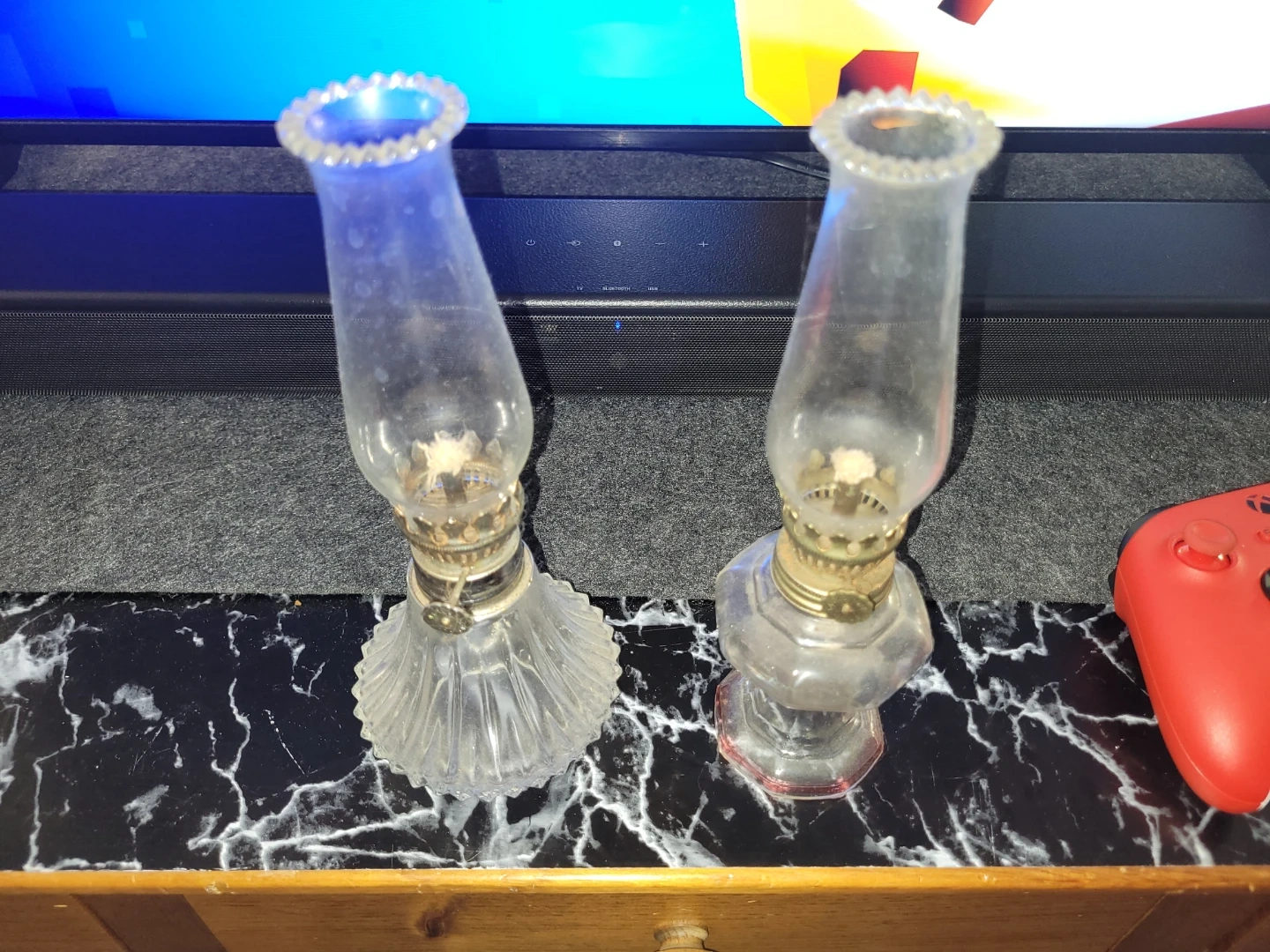 Two vintage-style glass oil lamps with metal fittings. Clear glass reservoirs and decorative bases. These lamps are great for ambient lighting!