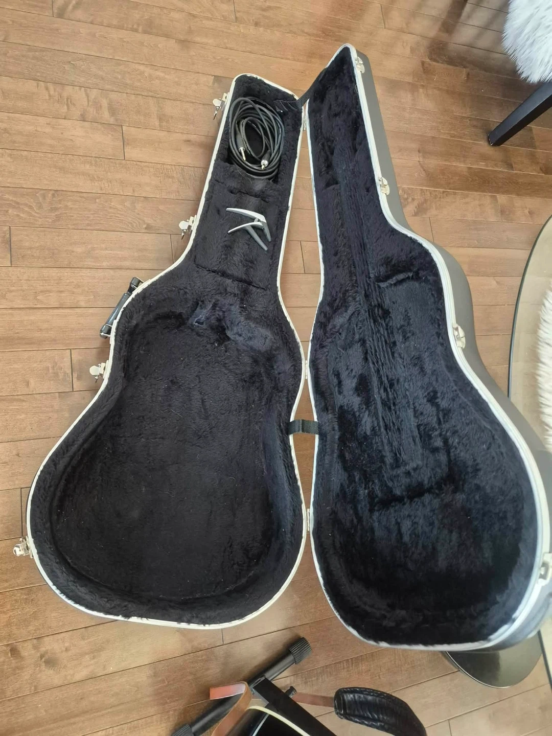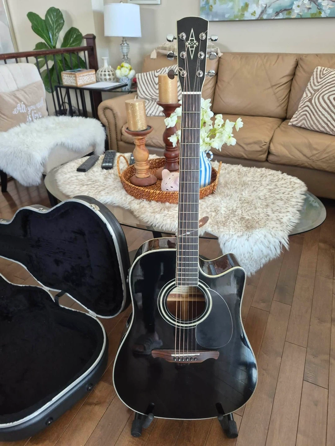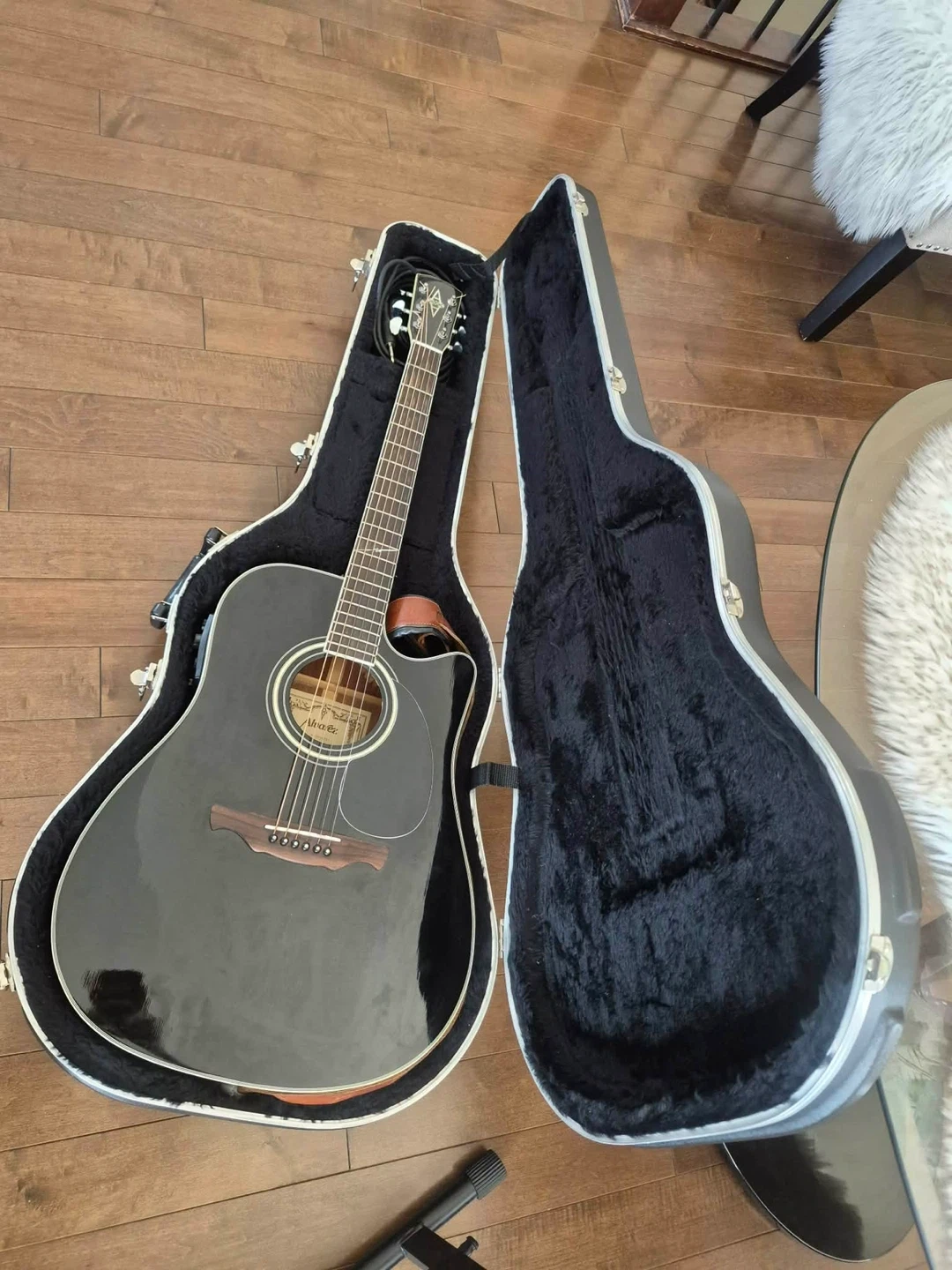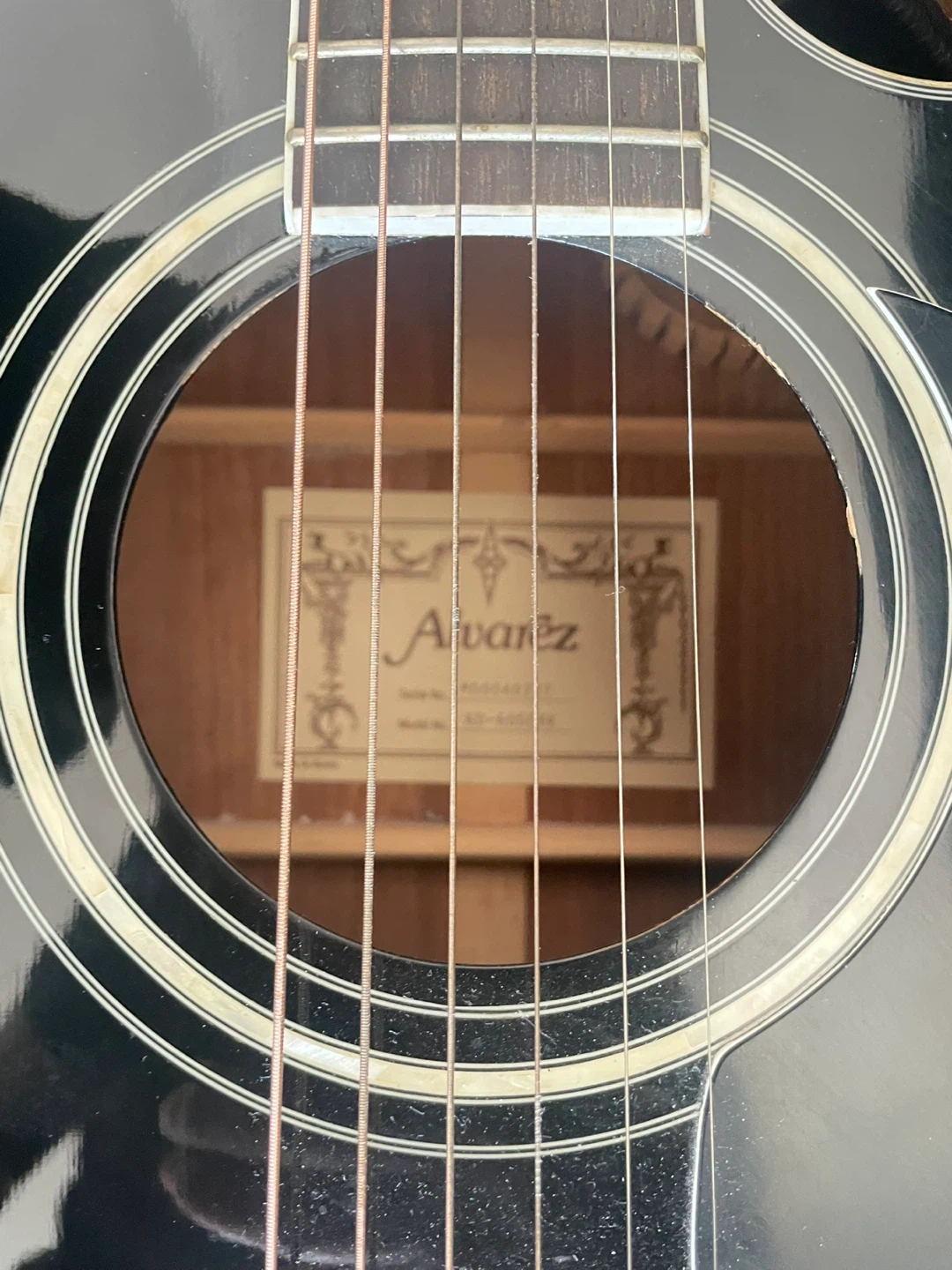 This Alvarez acoustic guitar is in black with a hard case. It has a cutaway body and electronics onboard. Includes a guitar strap and a cable.