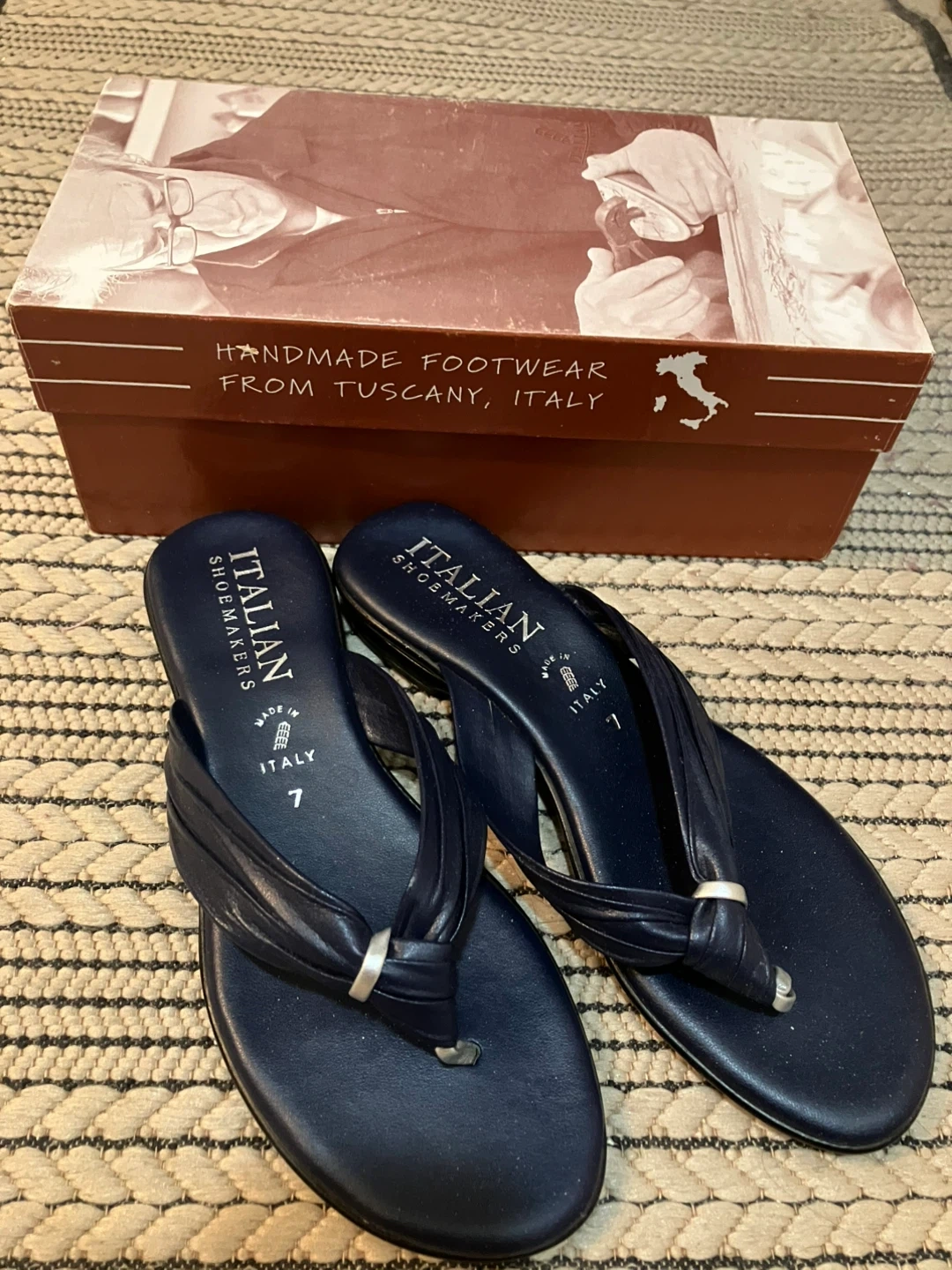 These Italian Shoemakers navy blue thong sandals are handmade in Italy. They're crafted from leather and feature a comfortable design. The size is 7.