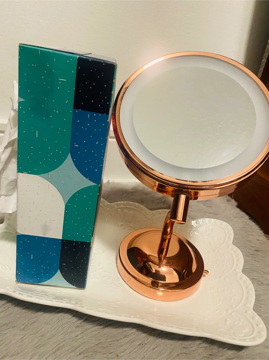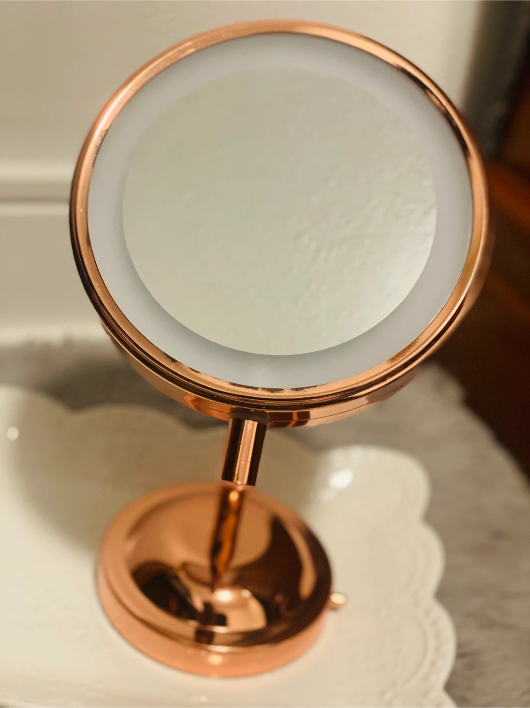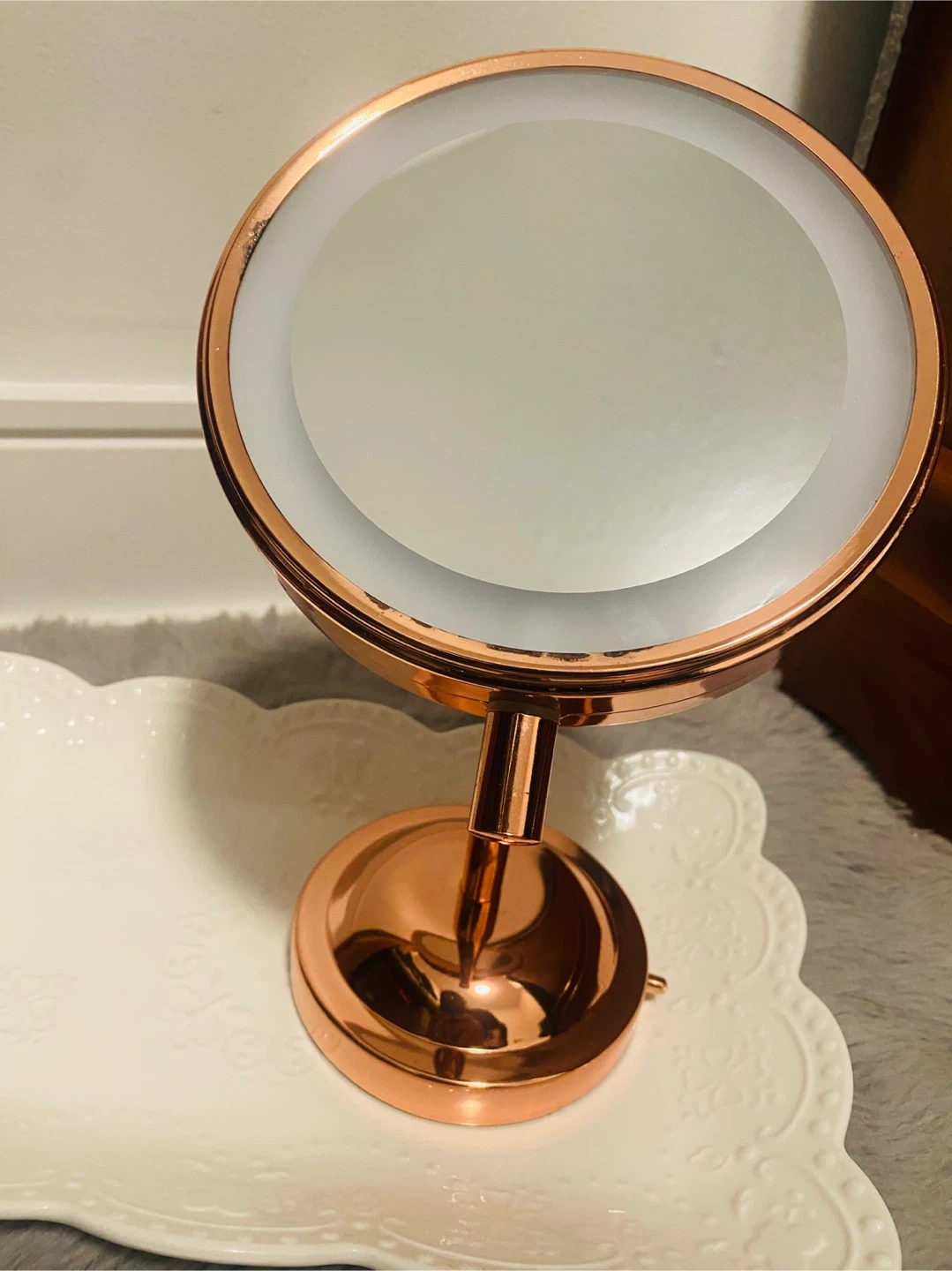 Add a touch of glam to your getting-ready routine with this illuminated vanity mirror! The rose gold finish is so stylish, and the built-in battery lights will help you achieve the perfect makeup application every time. It's in great condition. Cash only