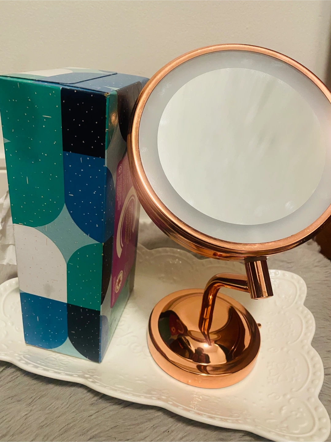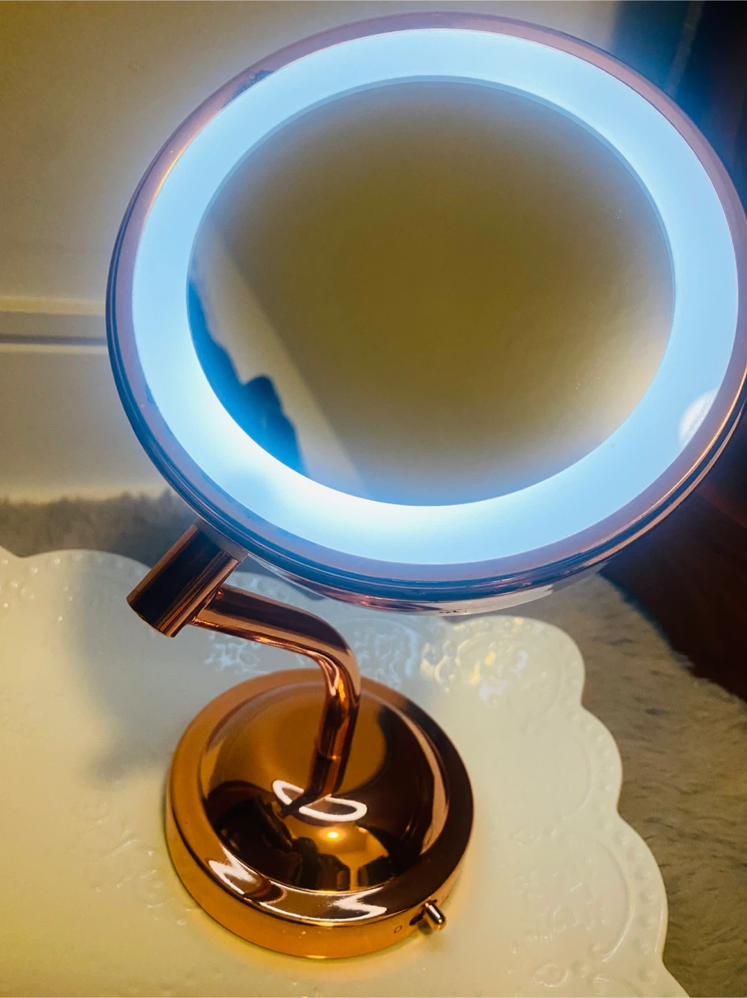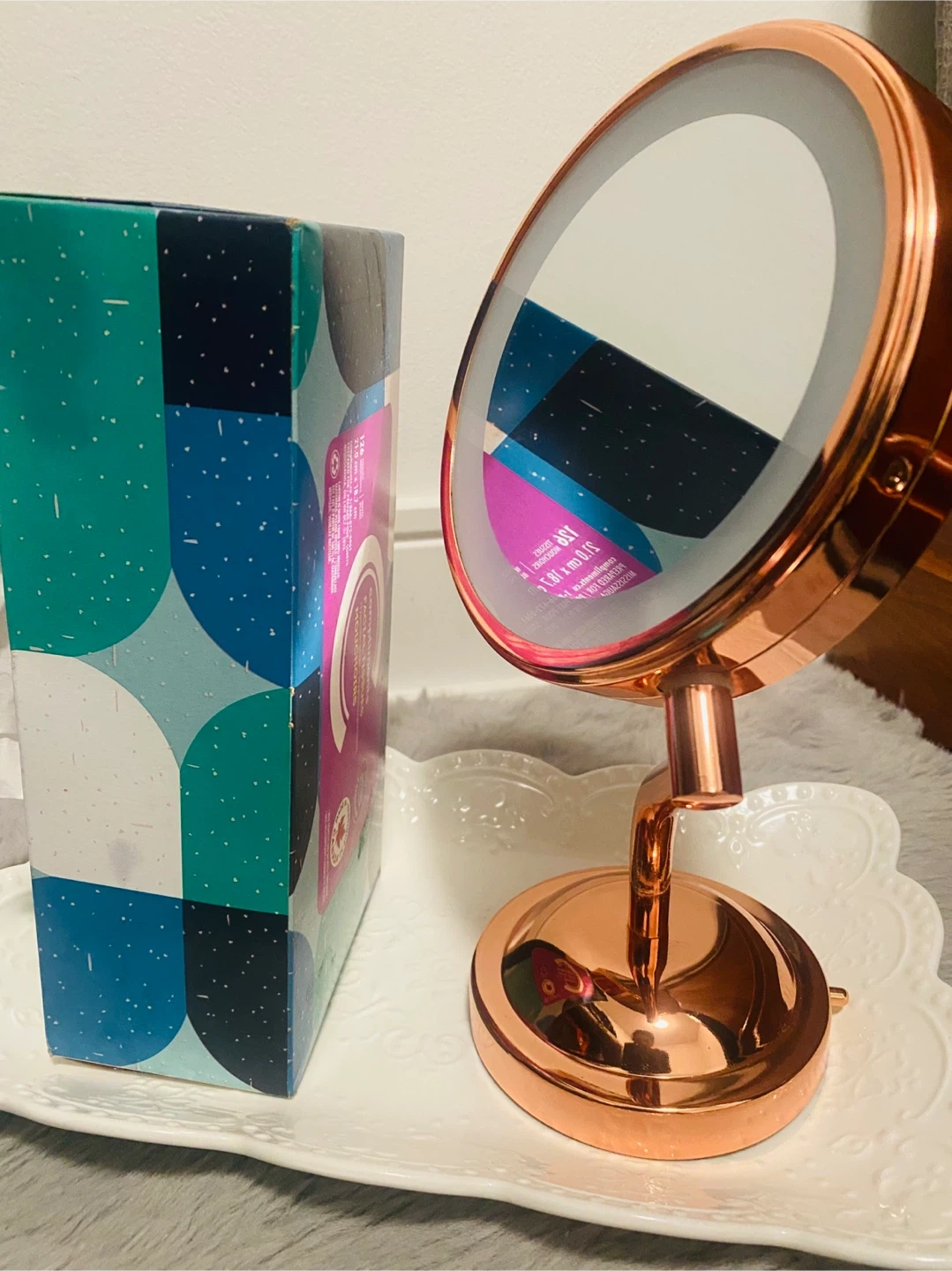 Add a touch of glam to your getting-ready routine with this illuminated vanity mirror! The rose gold finish is so stylish, and the built-in battery lights will help you achieve the perfect makeup application every time. It's in great condition. Cash only