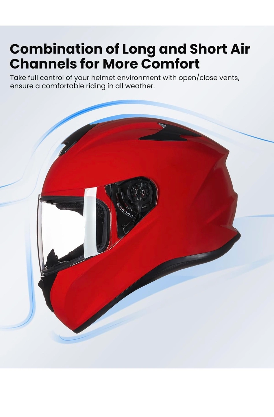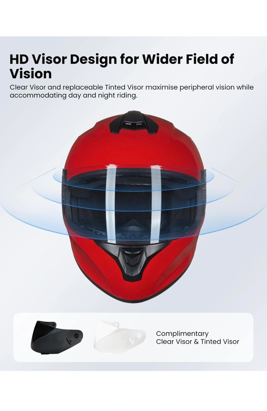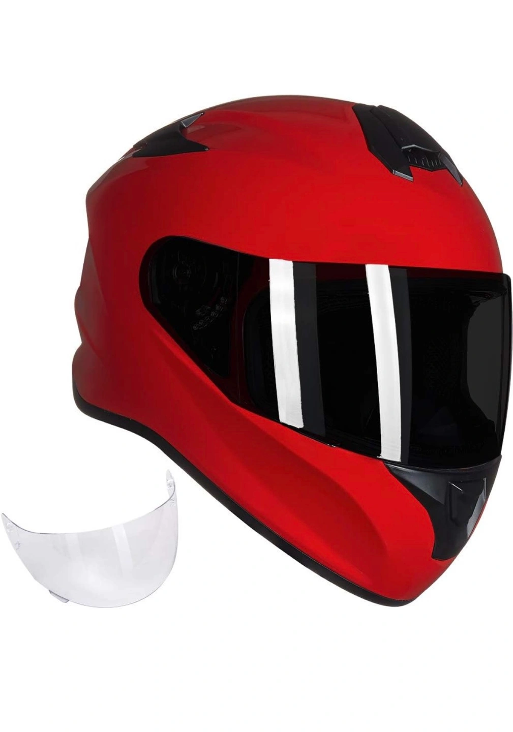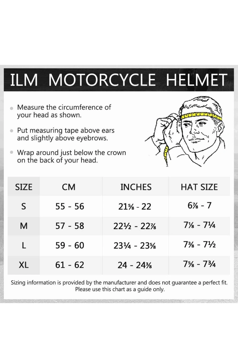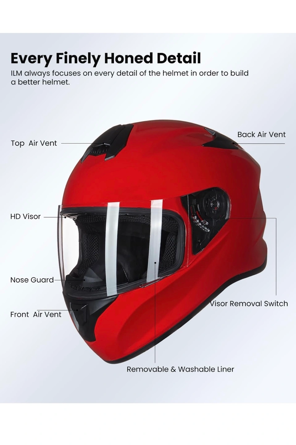 ILM brand motorcycle helmet. Red colour. Features HD visor, replaceable tinted visor, multiple air vents, and removable washable liner. Includes clear and tinted visors. Size chart provided in images. Check sizing before purchasing.