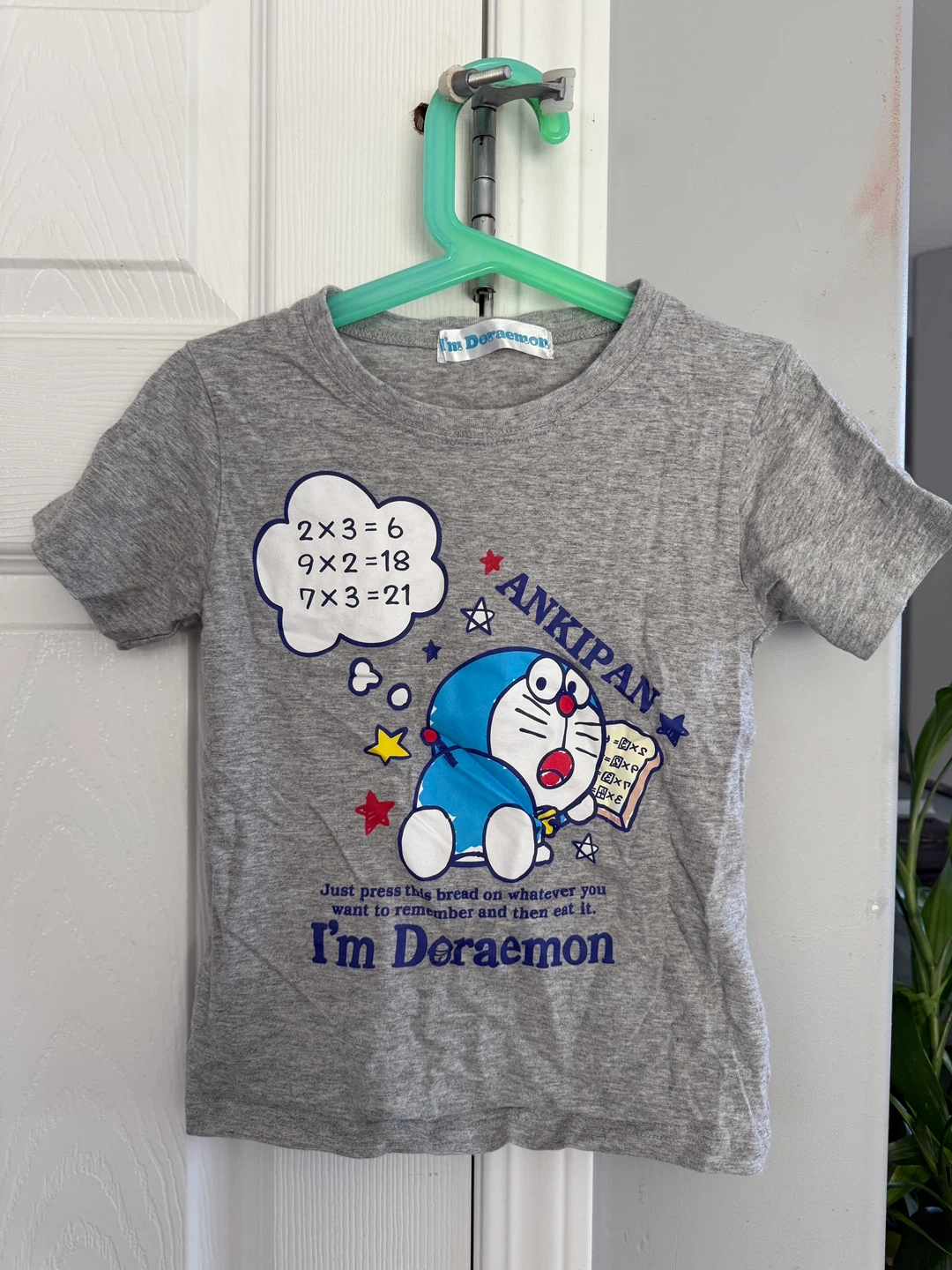 25Cute I'm Doraemon t-shirt for kids! The size is 110, perfect for little ones. The shirt features a fun Doraemon design with some math equations. The material is mainly cotton, making it comfy for everyday wear.