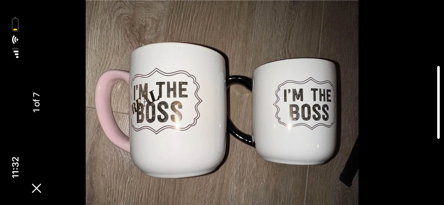 Two mugs that say "I'm the Boss" in gold lettering. One mug has a pink handle and the other has a black handle. They are in the style of coffee mugs. Can meet in Burnaby near Edmonds skytrain / Metrotown / along Marine Drive from Edmonds to Knight St / Near Knight/57th. Also flexible to meet within east/south Vancouver evenings. Check out my other listings :)