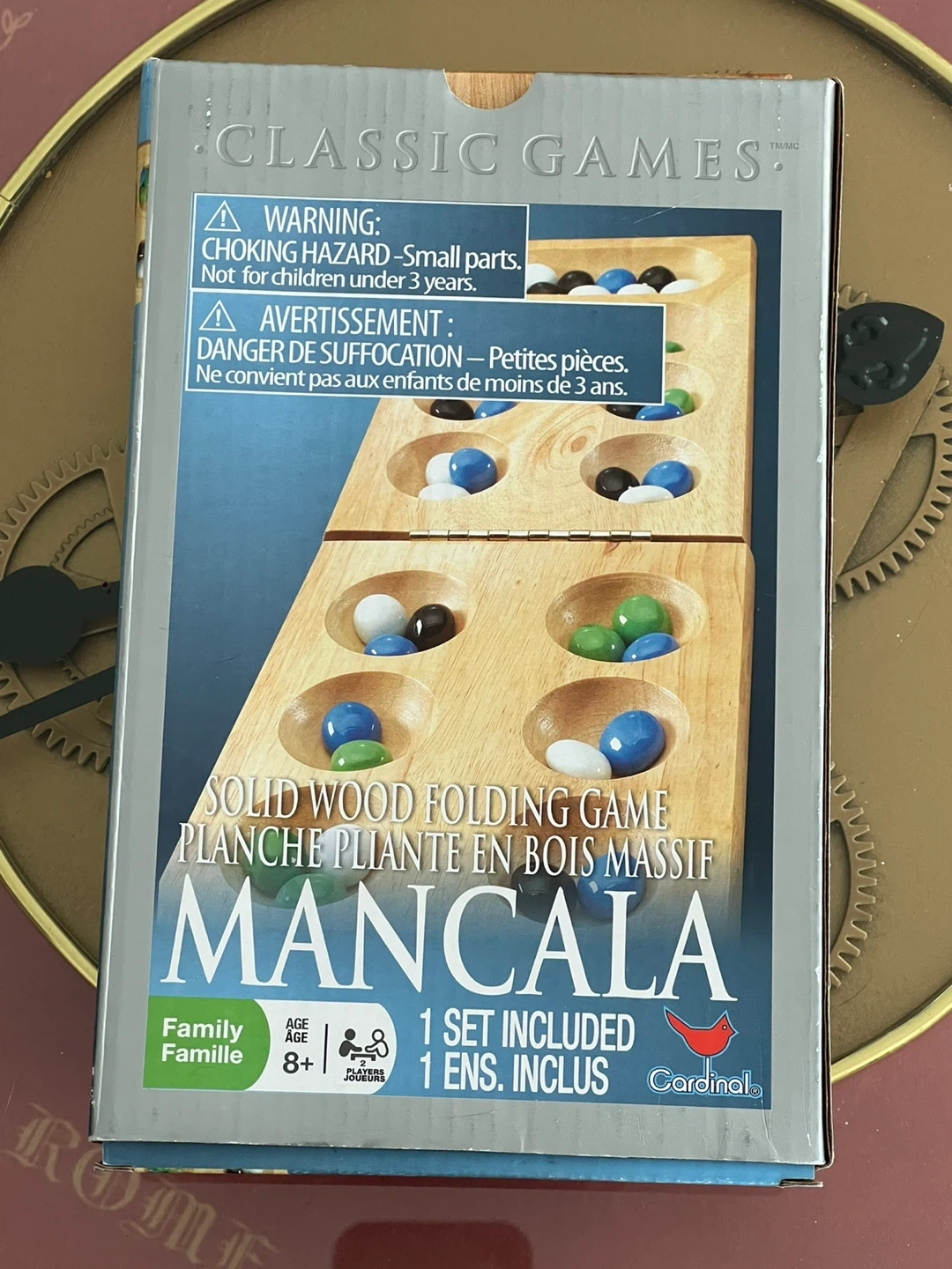 This is a solid wood folding Mancala game from Cardinal. It's recommended for ages 8 and up and includes 1 set for 2 players. The wooden board folds for easy storage.