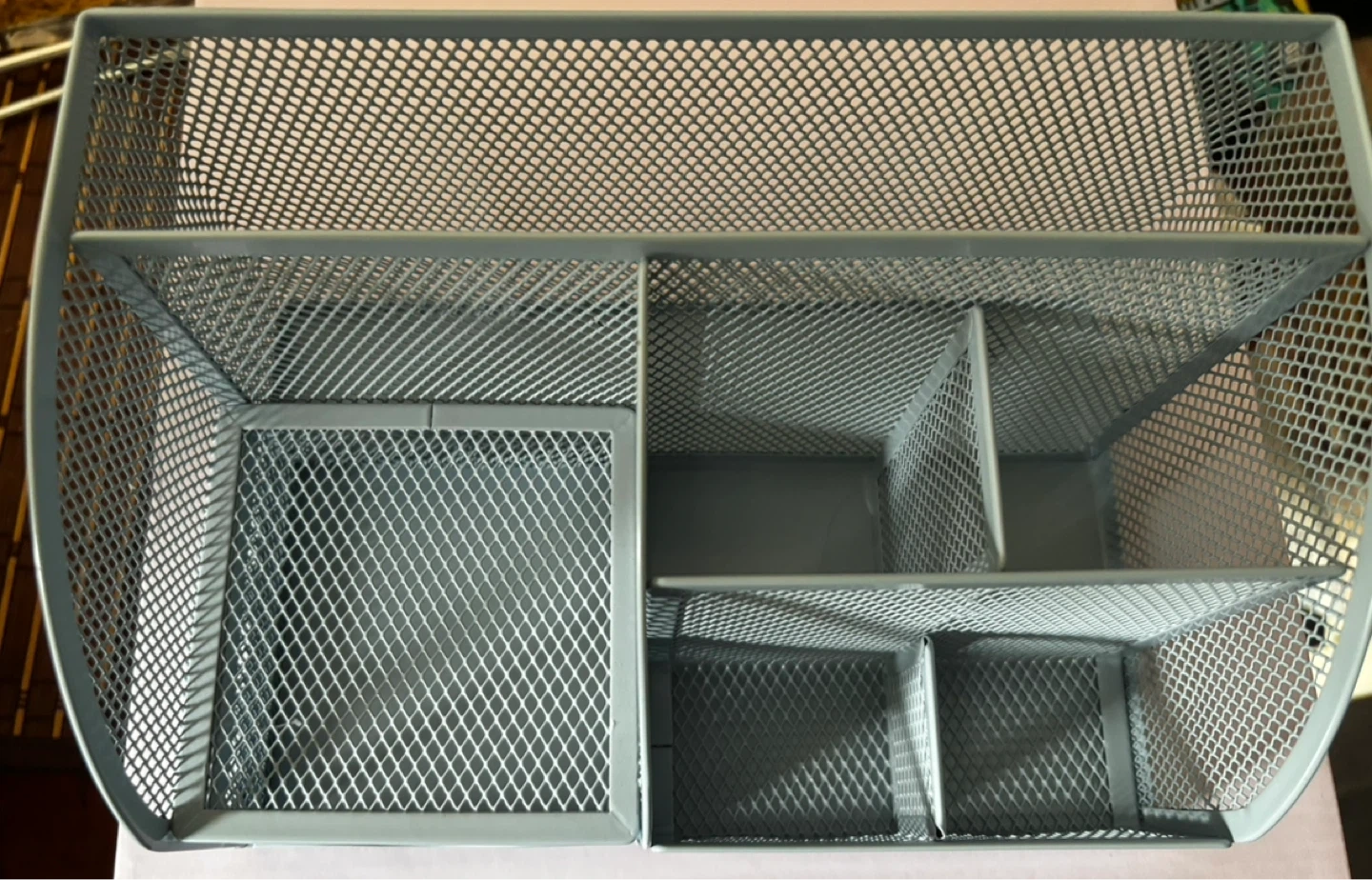 Keep your desktop tidy and organized with this ANNOVA mesh desktop organizer featuring 7 compartments and one pullout drawer. Made of durable metal mesh, this organizer is sturdy and long-lasting, perfect for home, office, or school use. Dimensions: 8.6 x 5.7 x 5 inches / 22 x 14.2 x 12.5 cm. The 7 compartments provide ample storage space for all your office supplies, such as pens, pencils, markers, paper clips, sticky notes, and more.