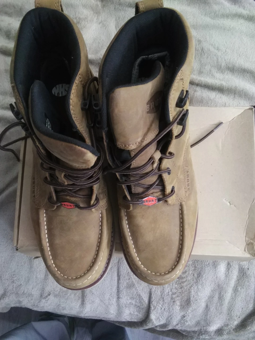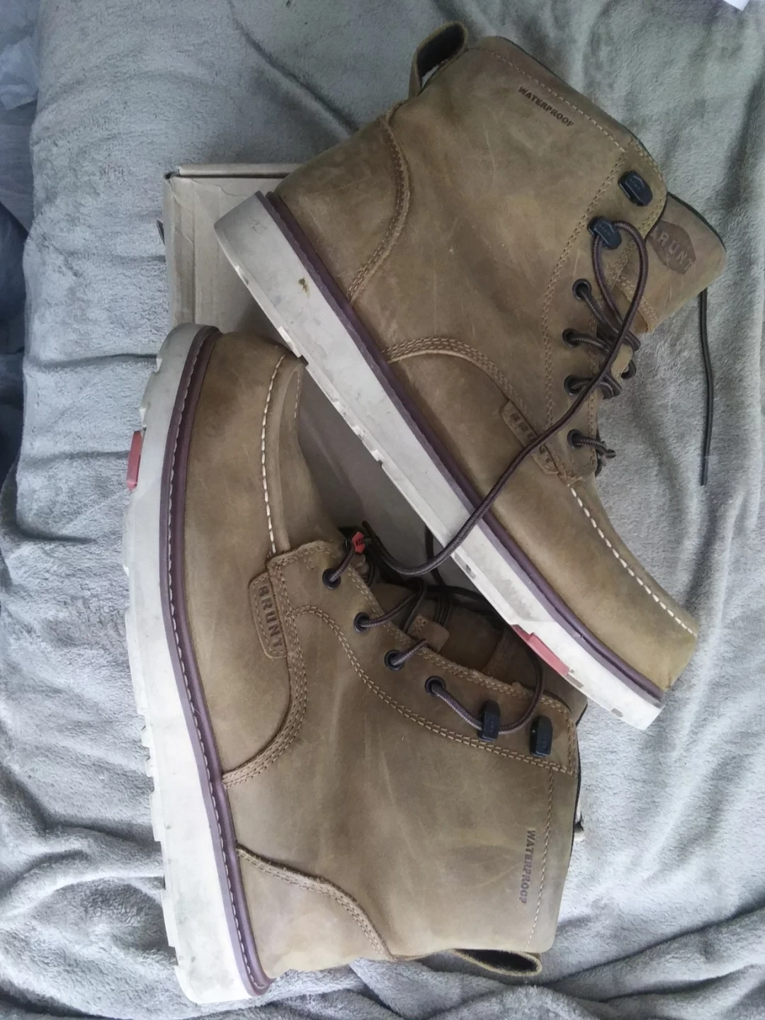 These Brunt work boots are made of brown leather and feature a waterproof design. They're a size 13.The soles show are in good condition. Perfect for demanding work environments!