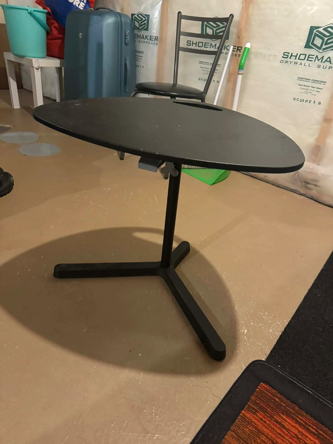 This adjustable black laptop table is perfect for use anywhere. It has a sturdy tripod base and a rotating, adjustable top. Its sleek design makes it a versatile addition to any space.
