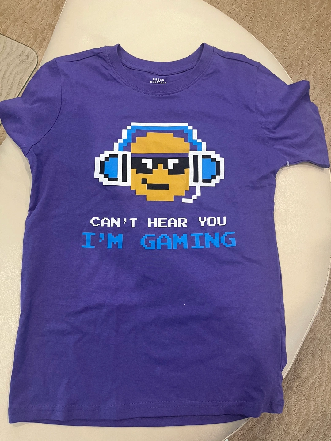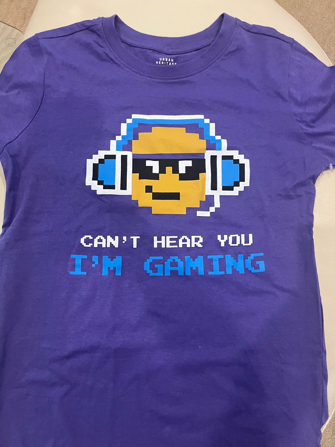 Purple T-shirt with "Can't hear you I'm gaming" graphic.