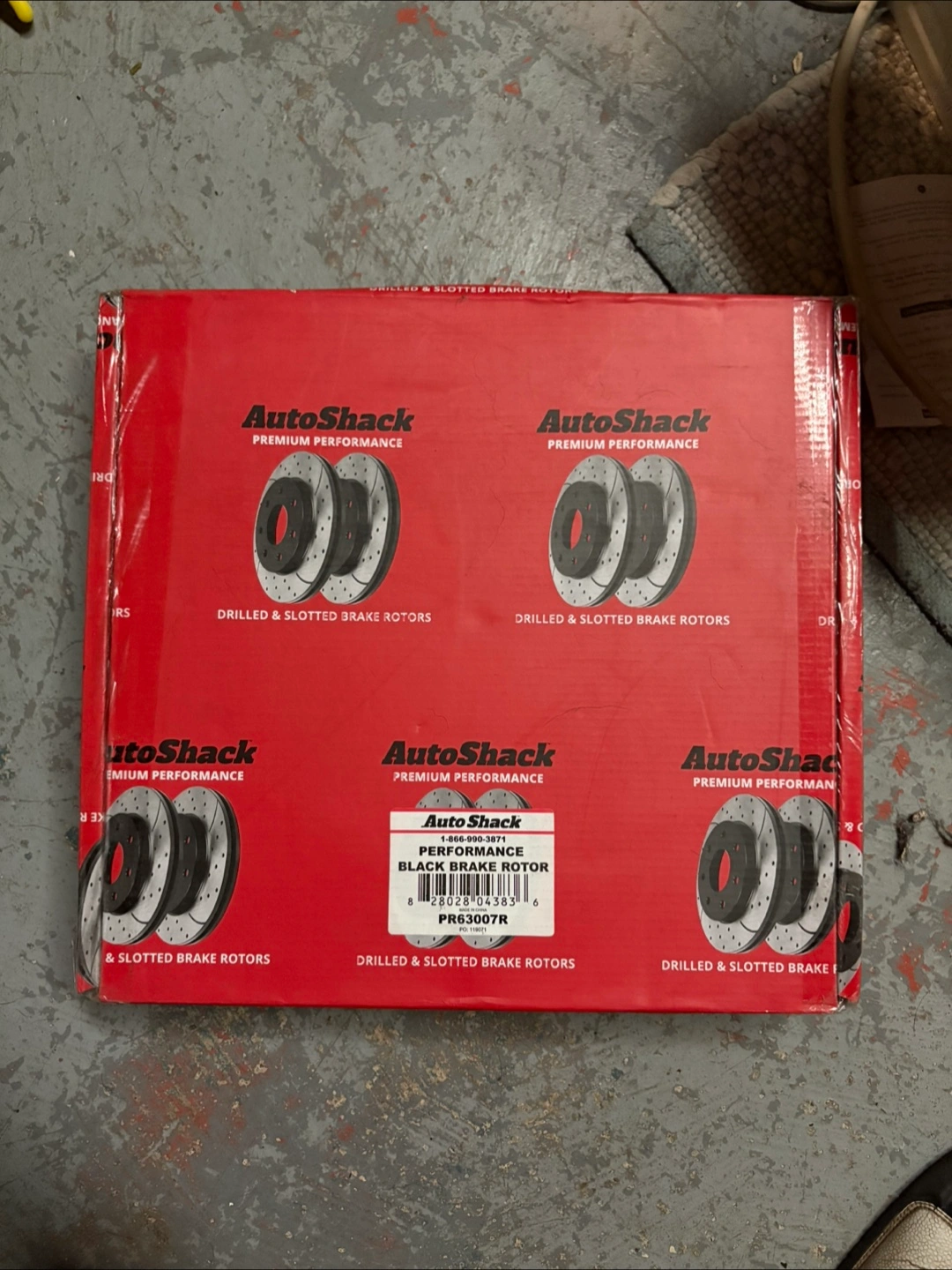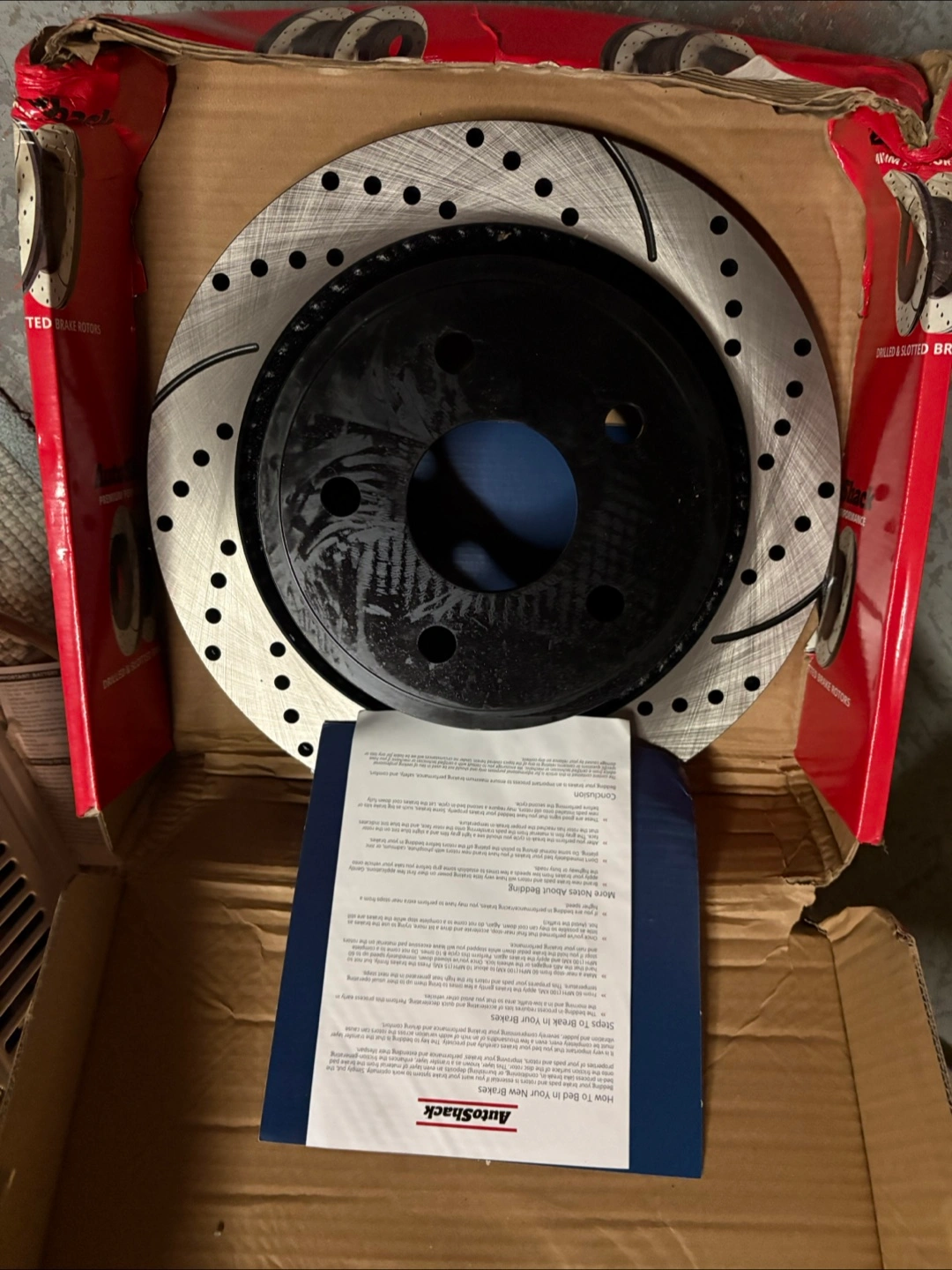 New AutoShack brake rotors and pads. Premium performance. Drilled and slotted rotors. Includes instructions. Perfect for upgrading your vehicle's braking system.