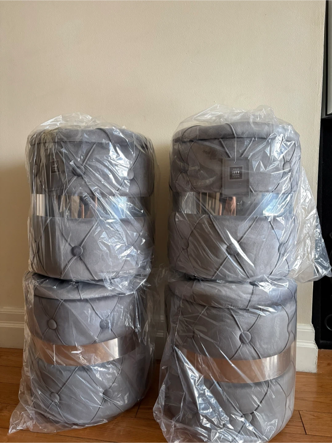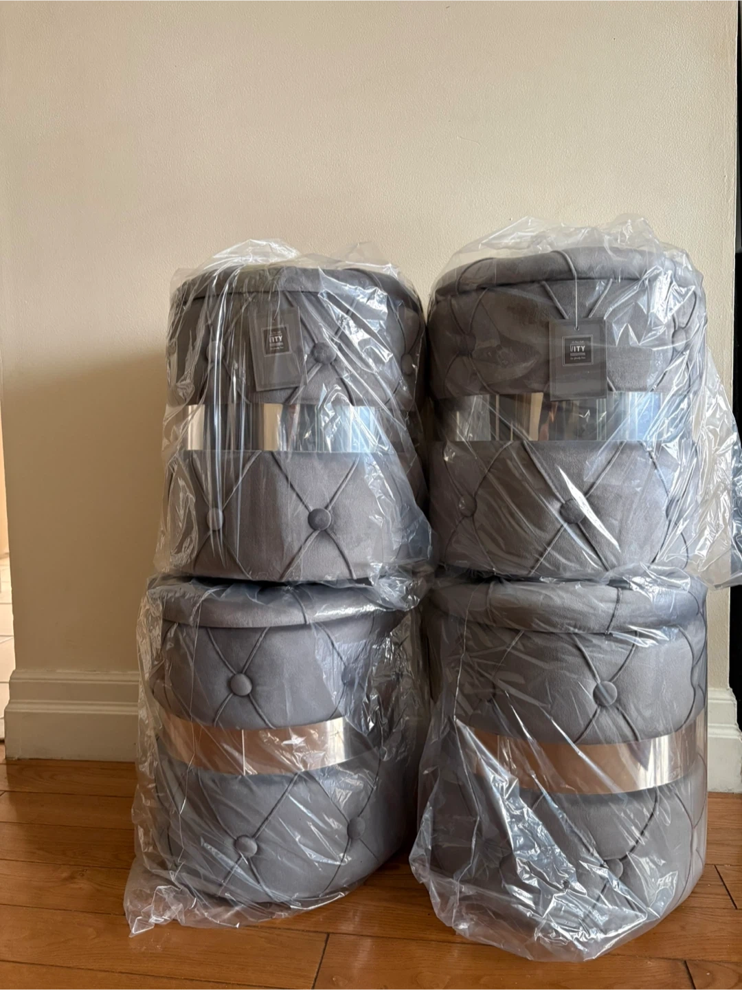 grey tufted ottoman poufs with a decorative silver band. These are compact and stylish additions to any room. They're ideal for extra seating or as a footrest.