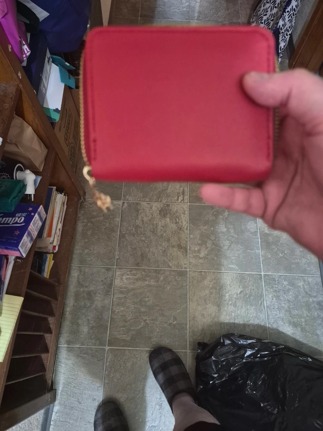 This red wallet features a cute cat design and the "Forever Young" logo. It's originally from Korea and has multiple card slots and a zippered coin pocket. The exterior is a faux leather material.