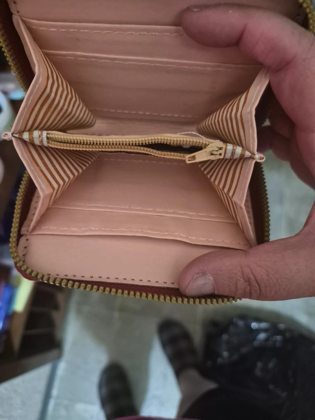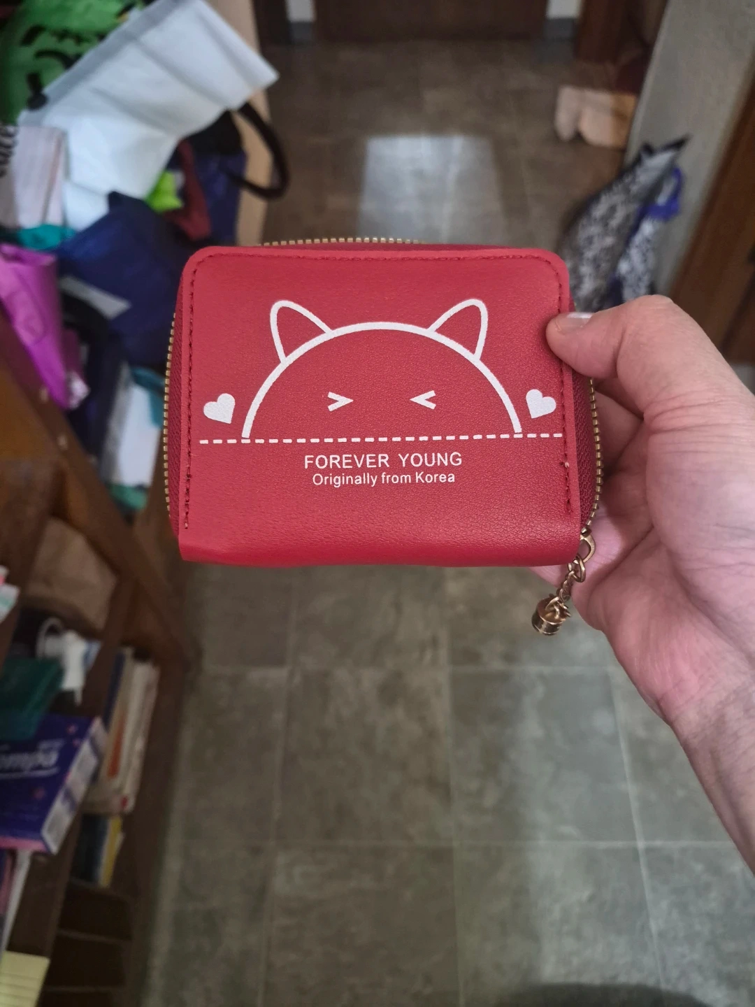 This red wallet features a cute cat design and the "Forever Young" logo. It's originally from Korea and has multiple card slots and a zippered coin pocket. The exterior is a faux leather material.
