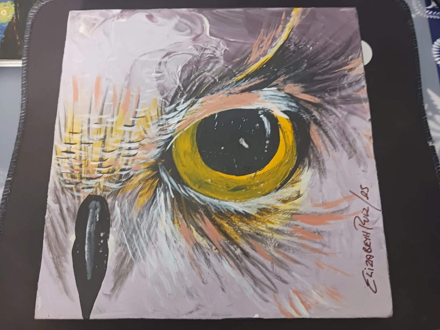 This is an original acrylic painting of an owl's eye. The artwork is signed by Elizabeth Ruiz and dated '25. It features vibrant colors and textured brushstrokes.