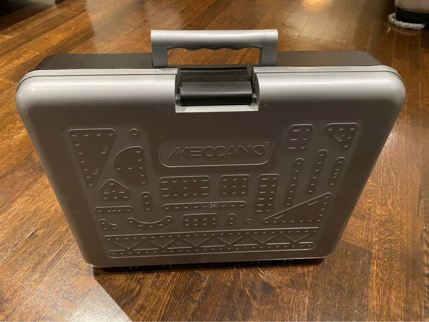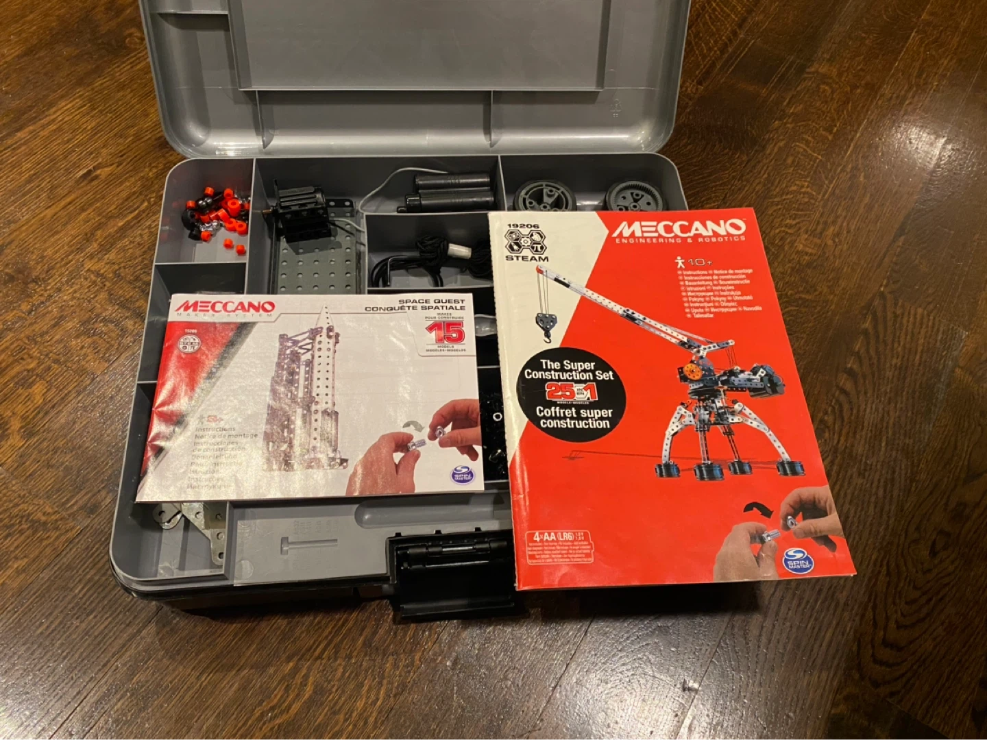 This is a Meccano Super Construction Set with a storage case. It includes various metal pieces, gears, and fasteners for building. Instructions are included for a crane model.