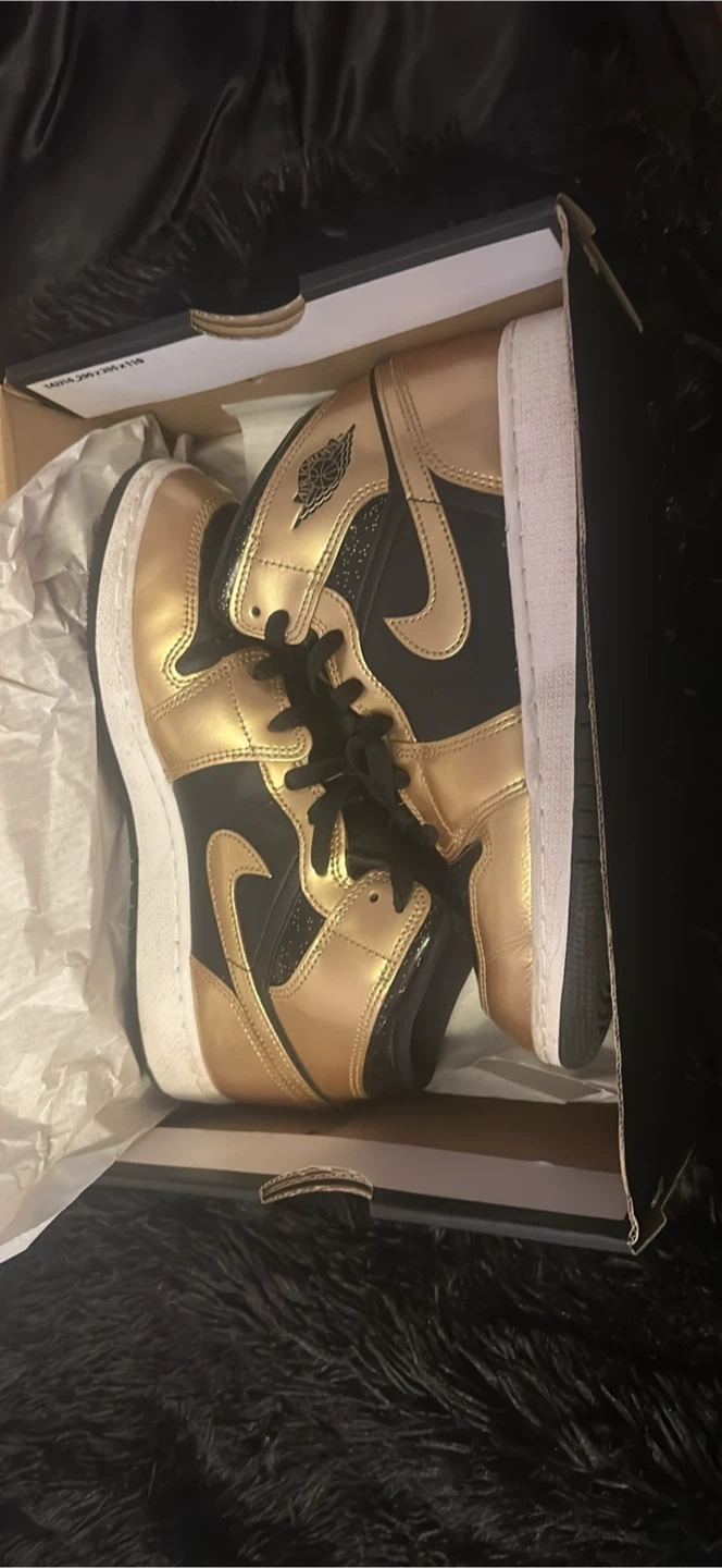 These Air Jordan 1 Mid sneakers come in a striking gold and black colourway. They're a mid-top design with lace-up closure. Includes original box.