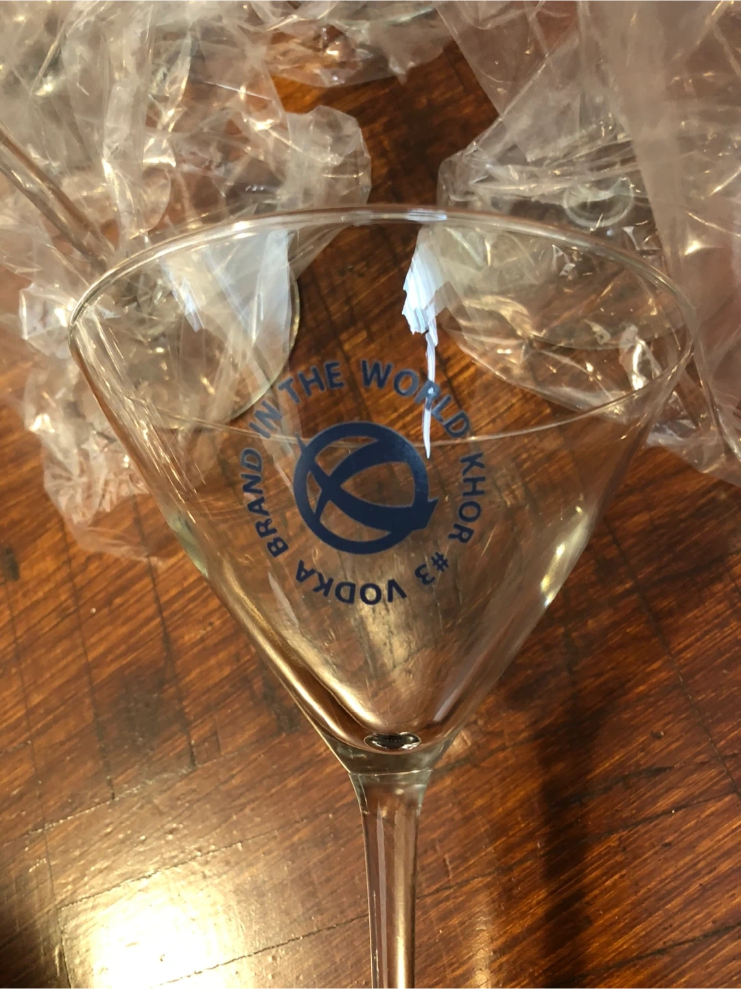 This is a Khor Vodka branded martini glass. It's made of clear glass and features blue lettering with the brand's logo and '#3 VODKA'. Perfect for enjoying your favourite cocktails!