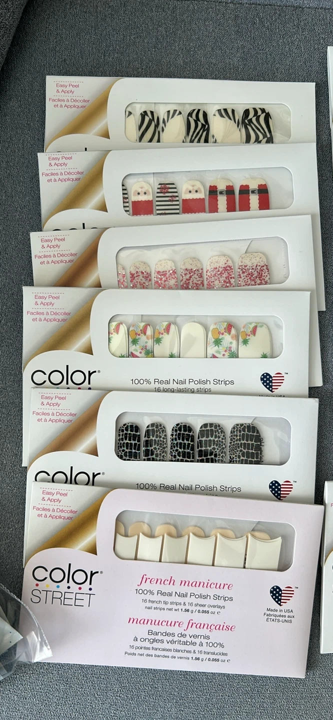 12 sets!!!! Get a salon-quality manicure at home with these Color Street 100% real nail polish strips. They're easy to apply and come in a variety of fun patterns. Includes nail polish remover pads for quick cleanup. Perfect for quick touch-ups or a full nail makeover!