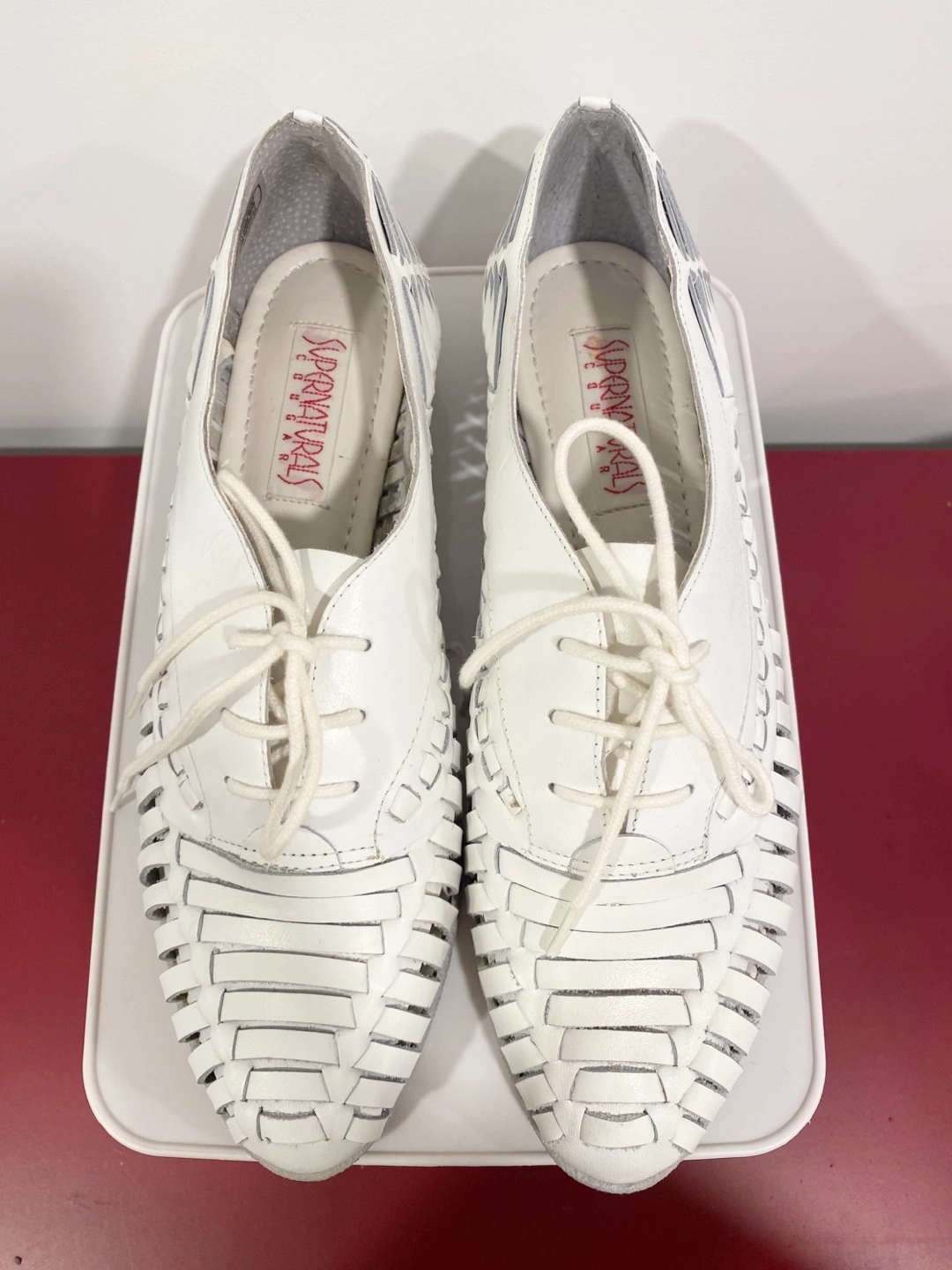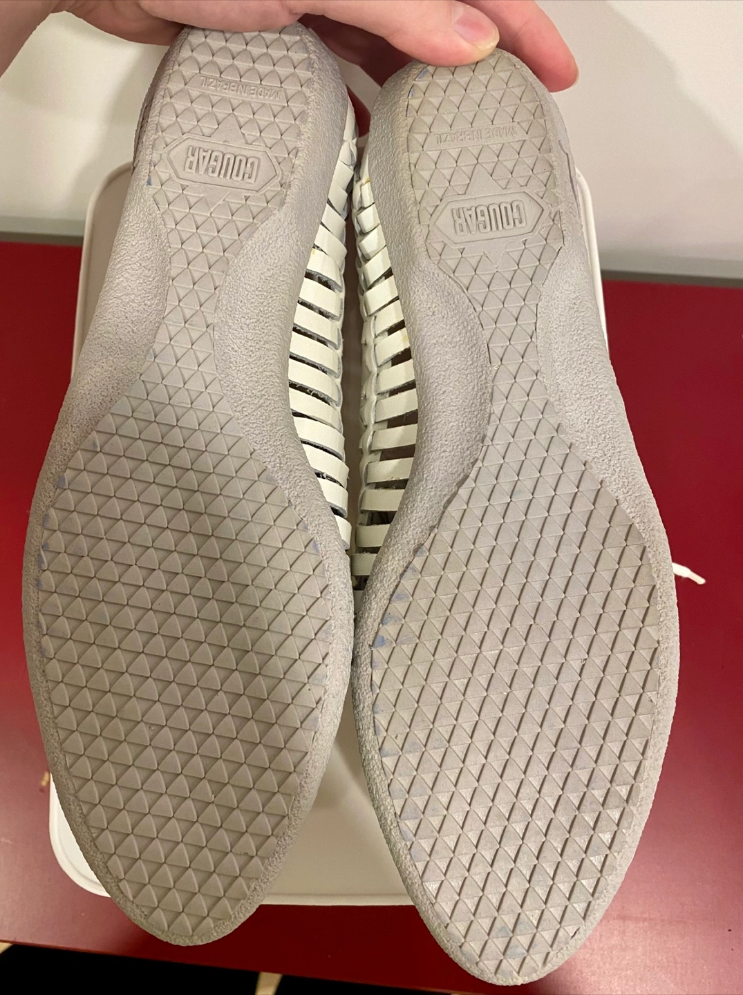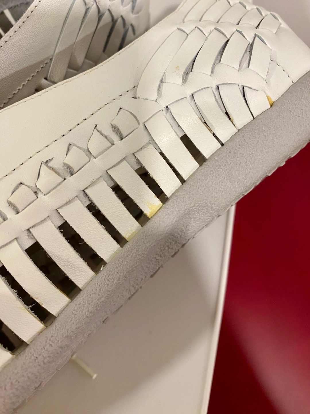 There is one small hole in the inner sole (see 4th photo), and some of the glue has yellowed due to age. Nevertheless these are gorgeous shoes.