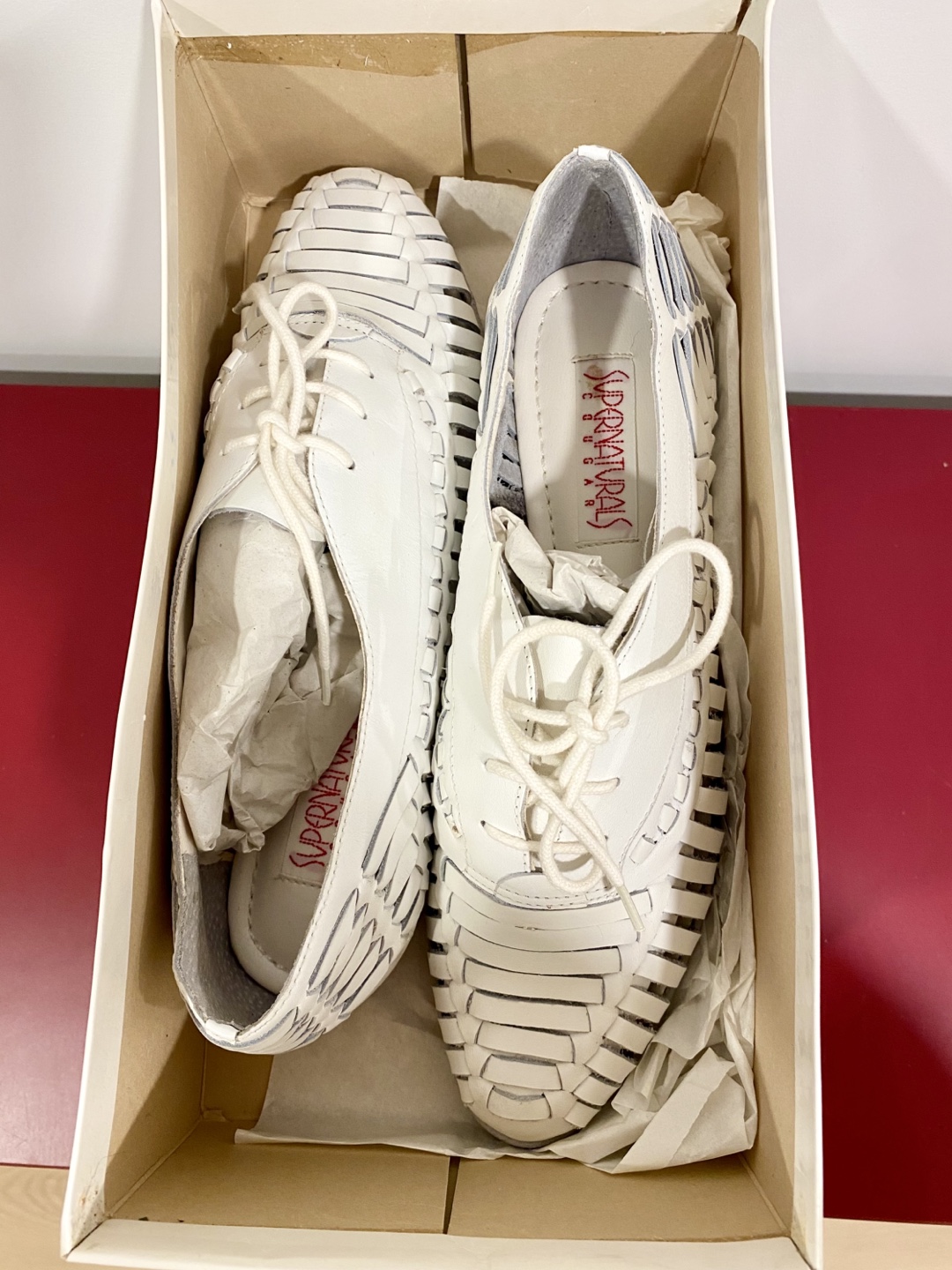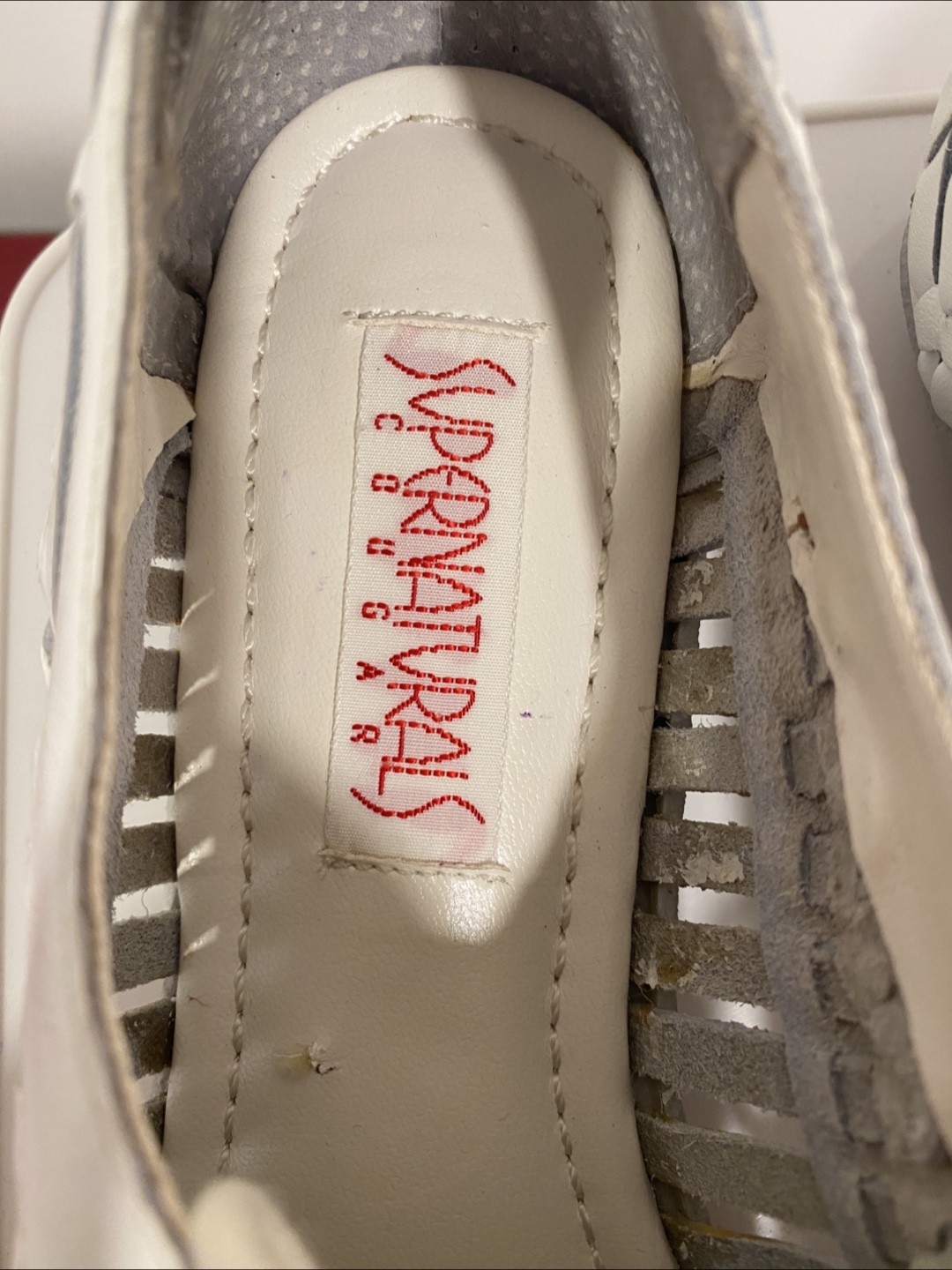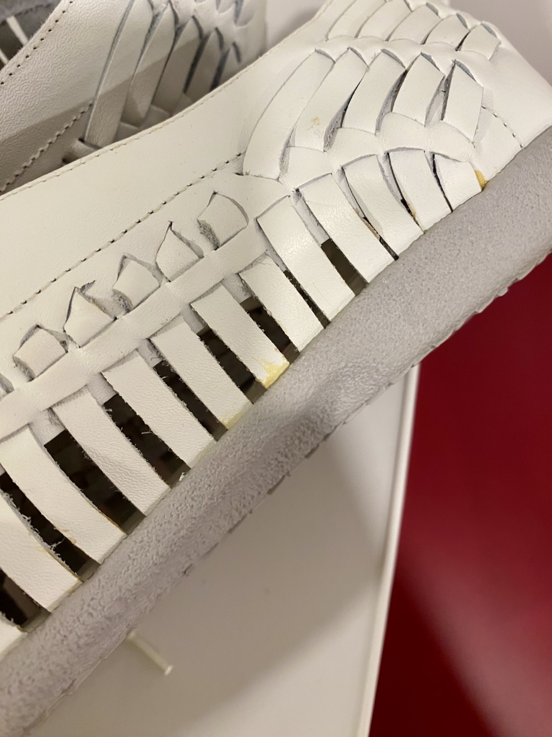 There is one small hole in the inner sole (see 4th photo), and some of the glue has yellowed due to age. Nevertheless these are gorgeous shoes.