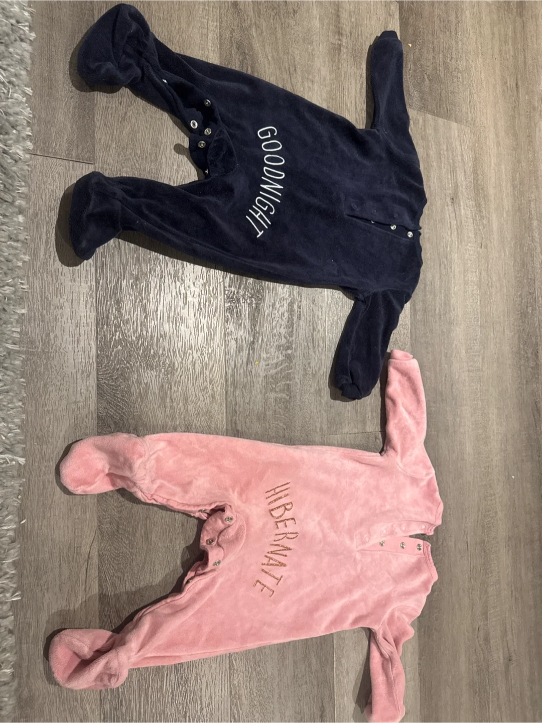 Two soft velour footie sleepers, one pink with embroidered moons and one navy with "GOODNIGHT" text. These onesies have snap closures down the front for easy changes. Perfect for cozy nights or lounging.